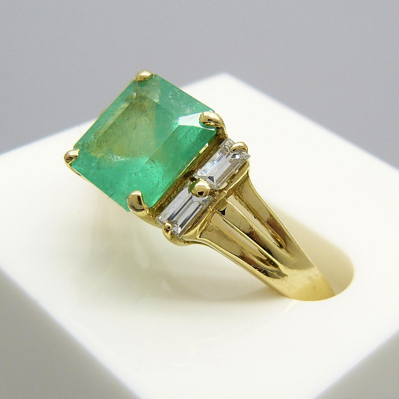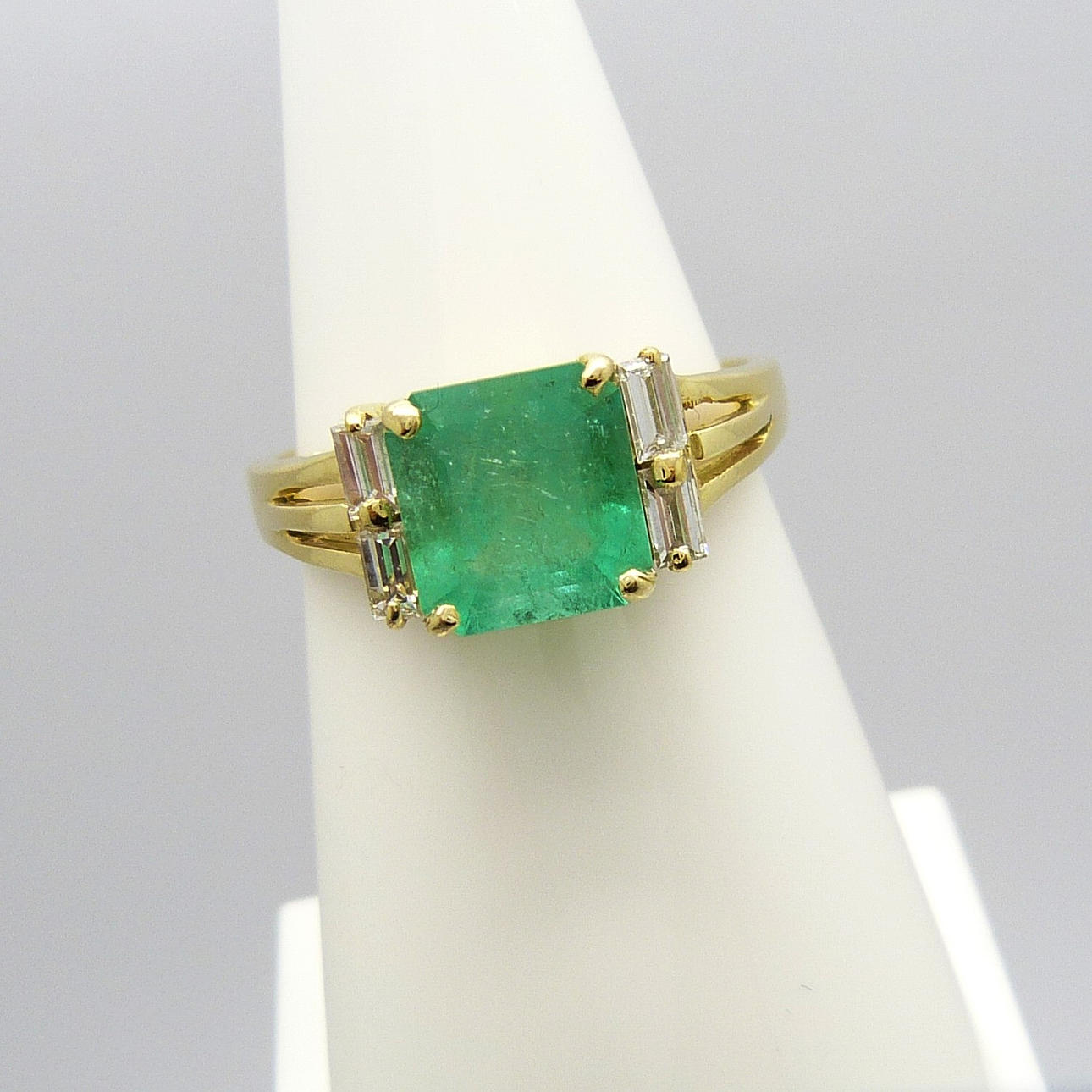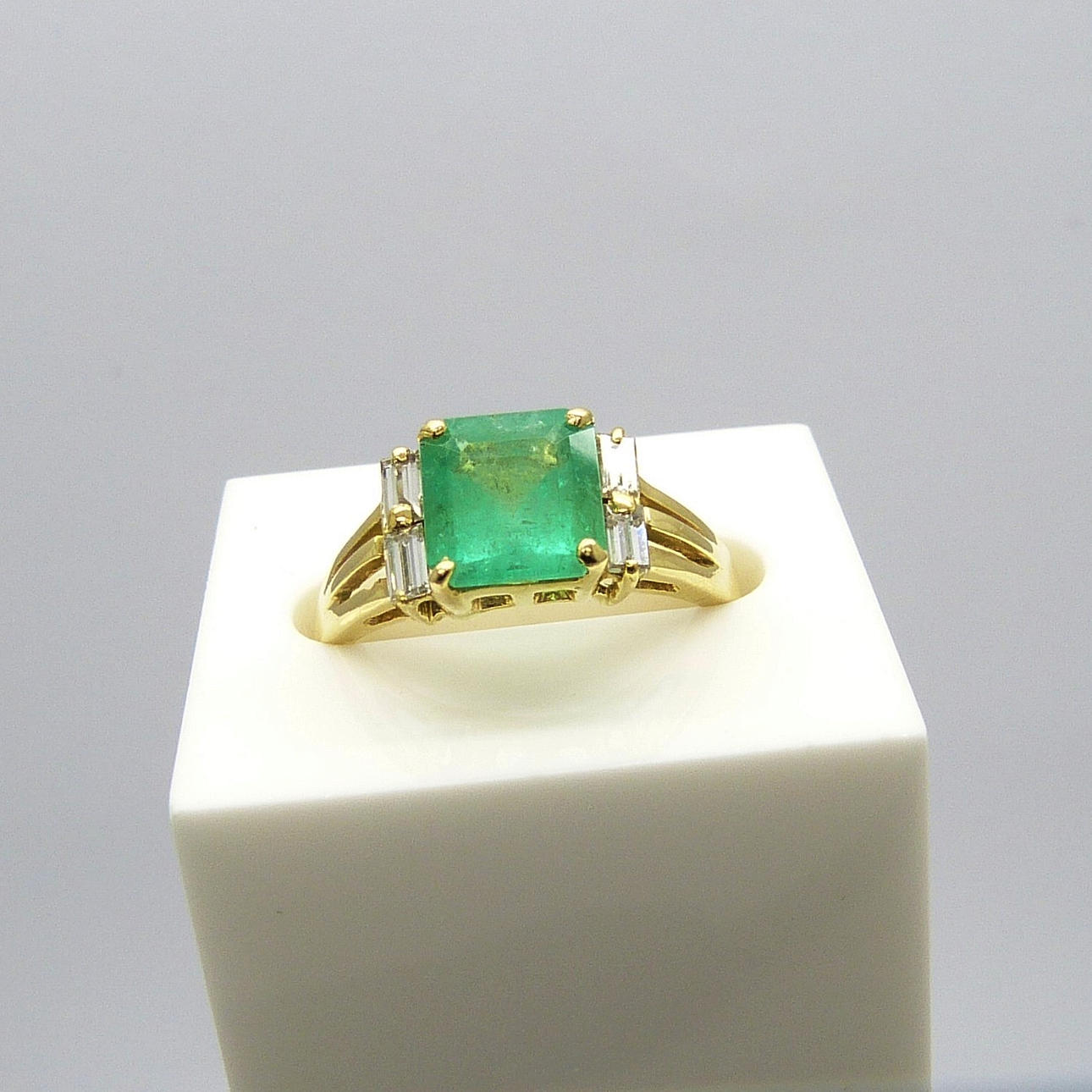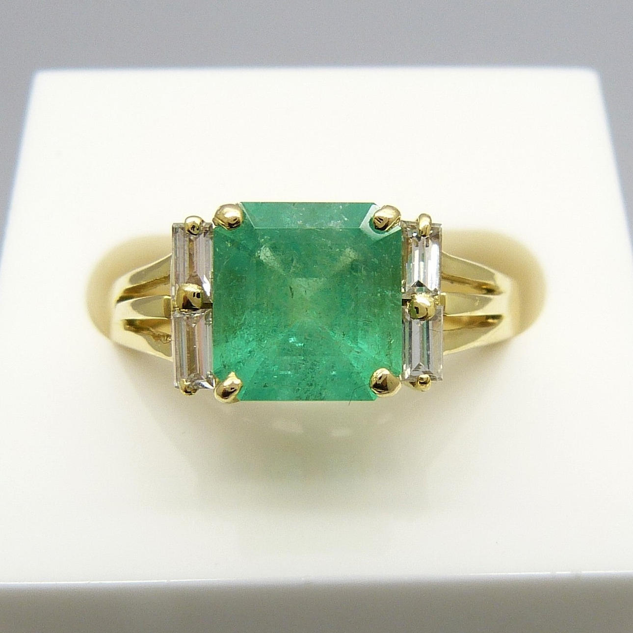 An 18k yellow gold ring set with a 1.73ct square emerald and 4 baguette diamonds totalling 0.20ct approx.