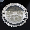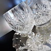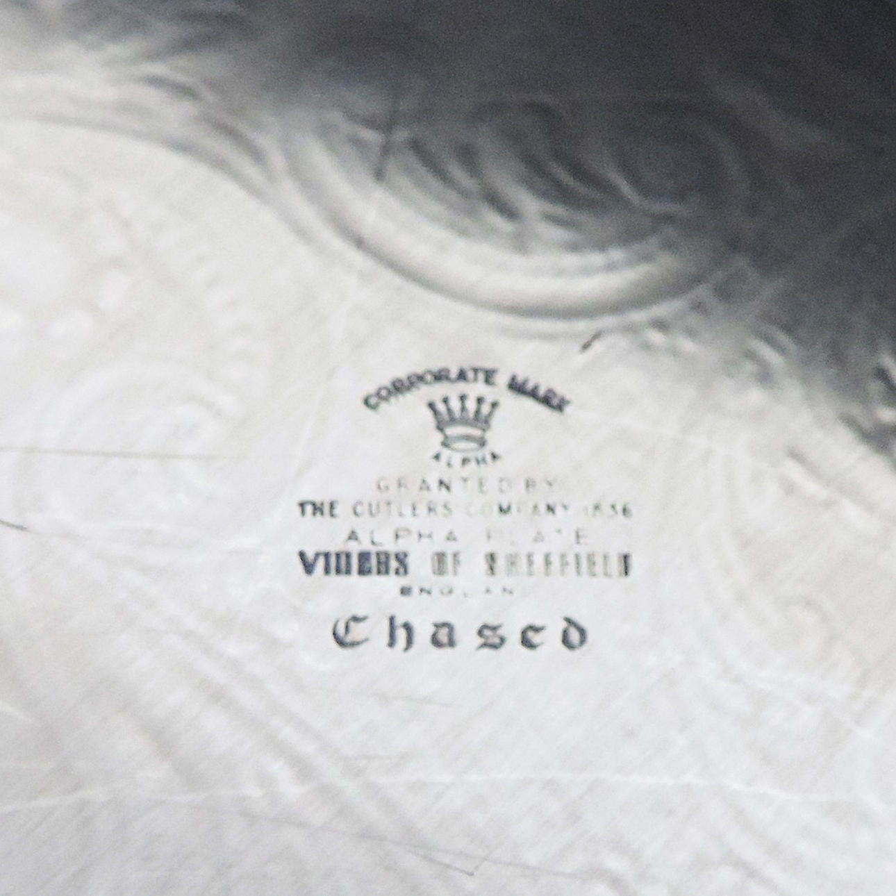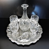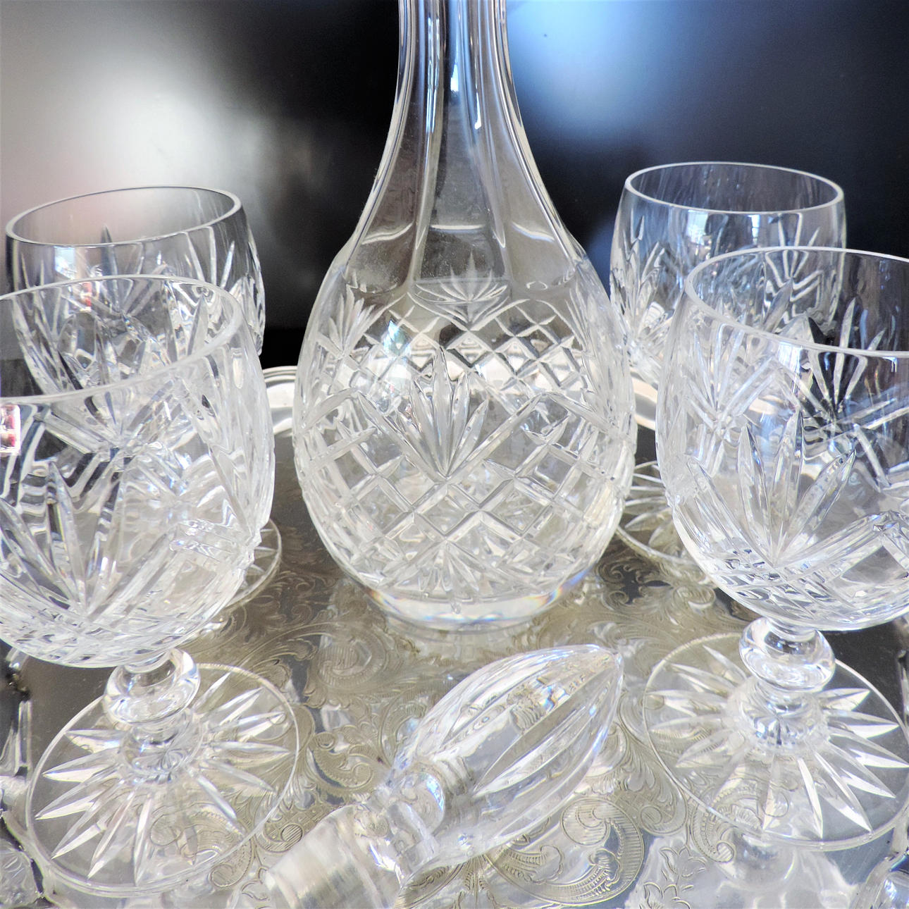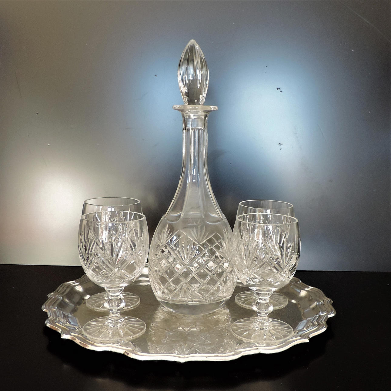 A drinks set comprising cut crystal decanter and 4 wine goblets on a vintage Viners silver plated serving tray. Measurements: Tray 37cm diameter, Decanter 35cm high & 12cm diameter, glasses 14cm high & 8cm rim diameter.