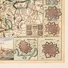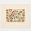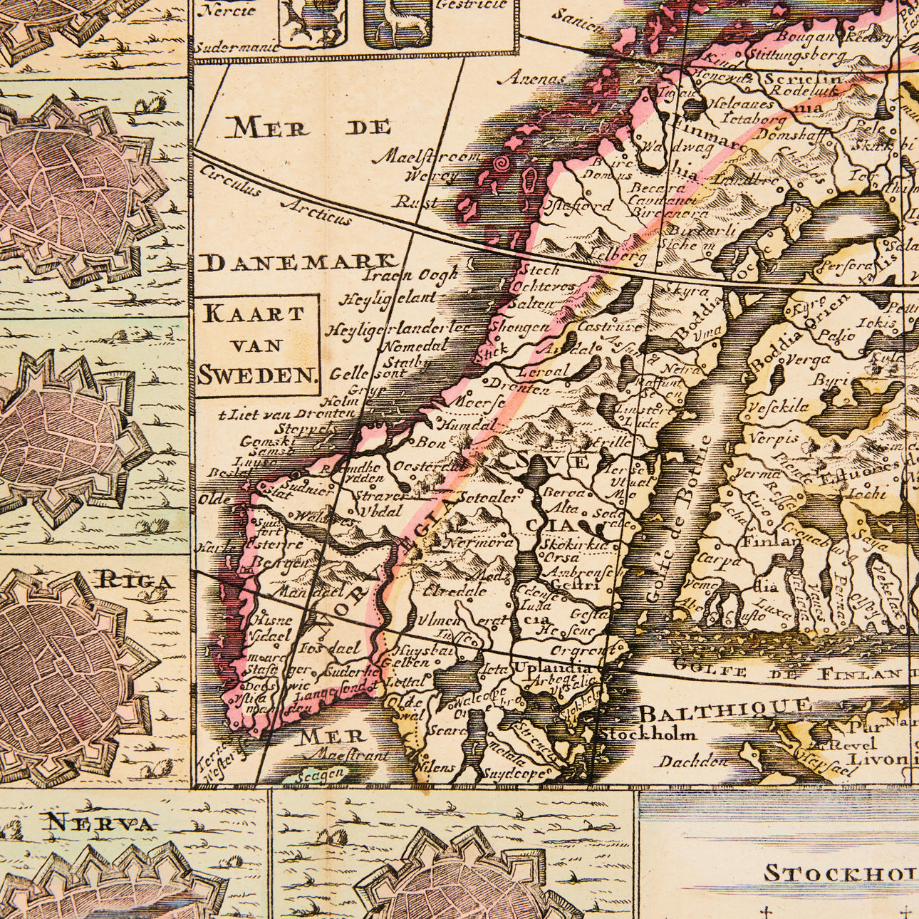 Colored (old) engraved map of Norway, Sweden, Finland, part of Russia and the Baltics, surrounded by 12 small pictures of fortresses (Riga, Narva, Lund, Kalmar, Wiborg, Pernå ao), a small view of Stockholm and two with provincial coats-of-arms. About 180x260 mm.