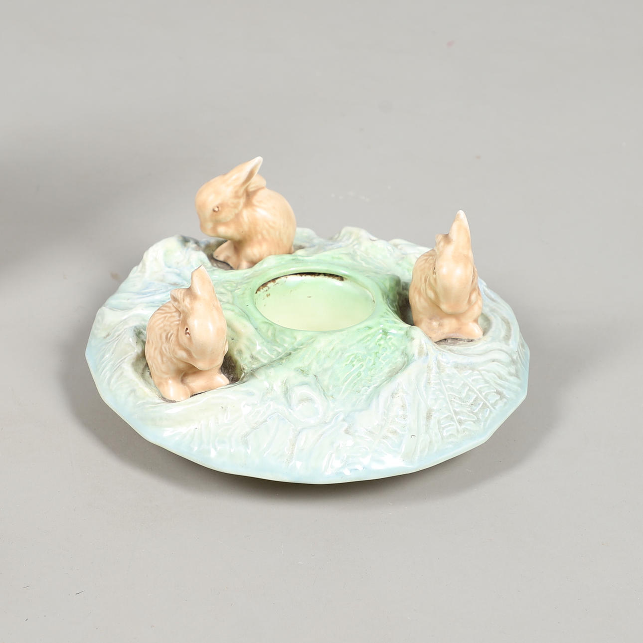 general crazing to the body of the jug, hairline crack to leaf bowl, broken ear to squirrel table centrepiece.