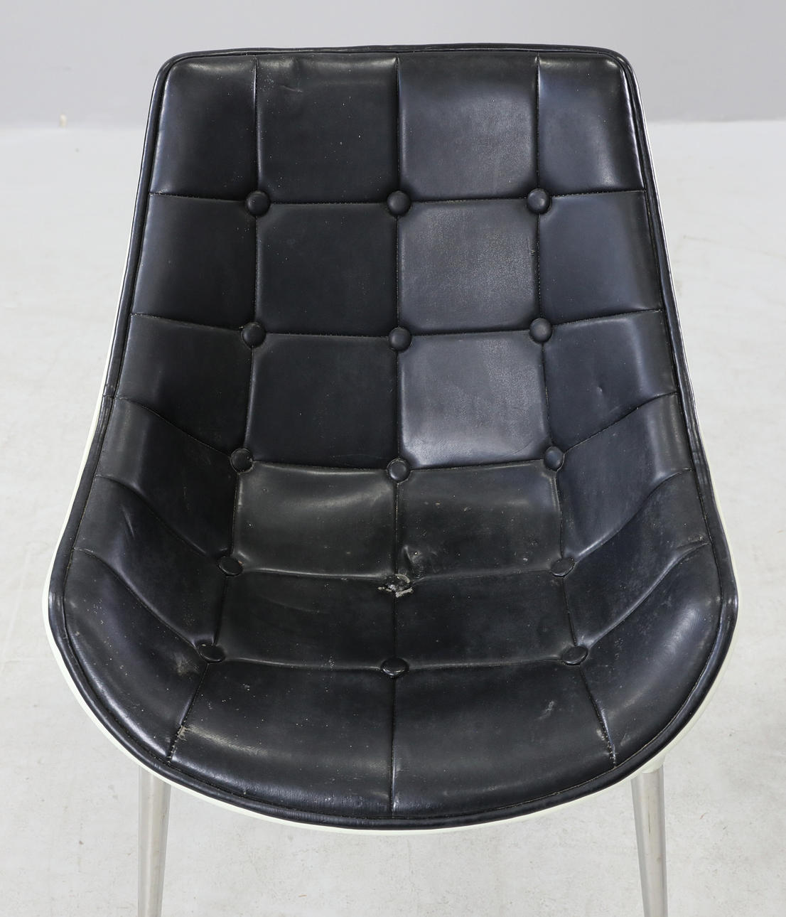 Shiny plastic, covered in black leather, legs in metal.