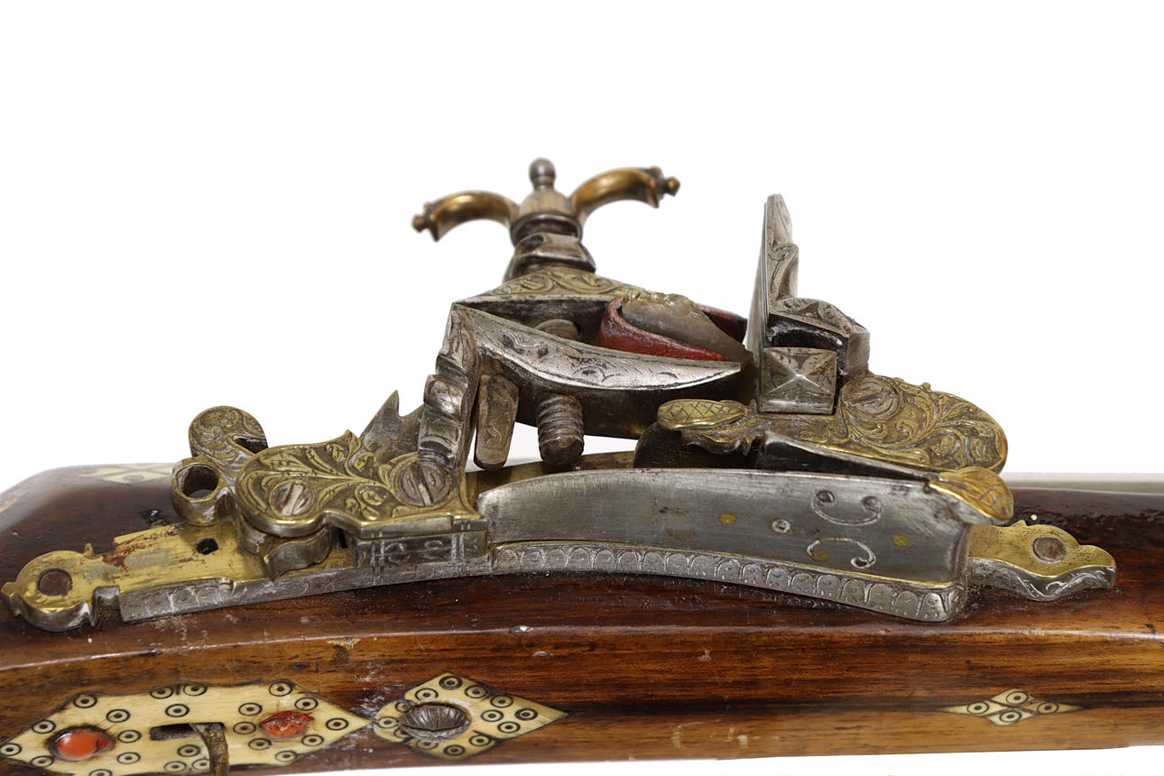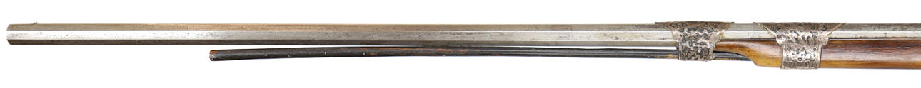 Octagonal barrel approx. 135 cm, wooden butt with intarsia.