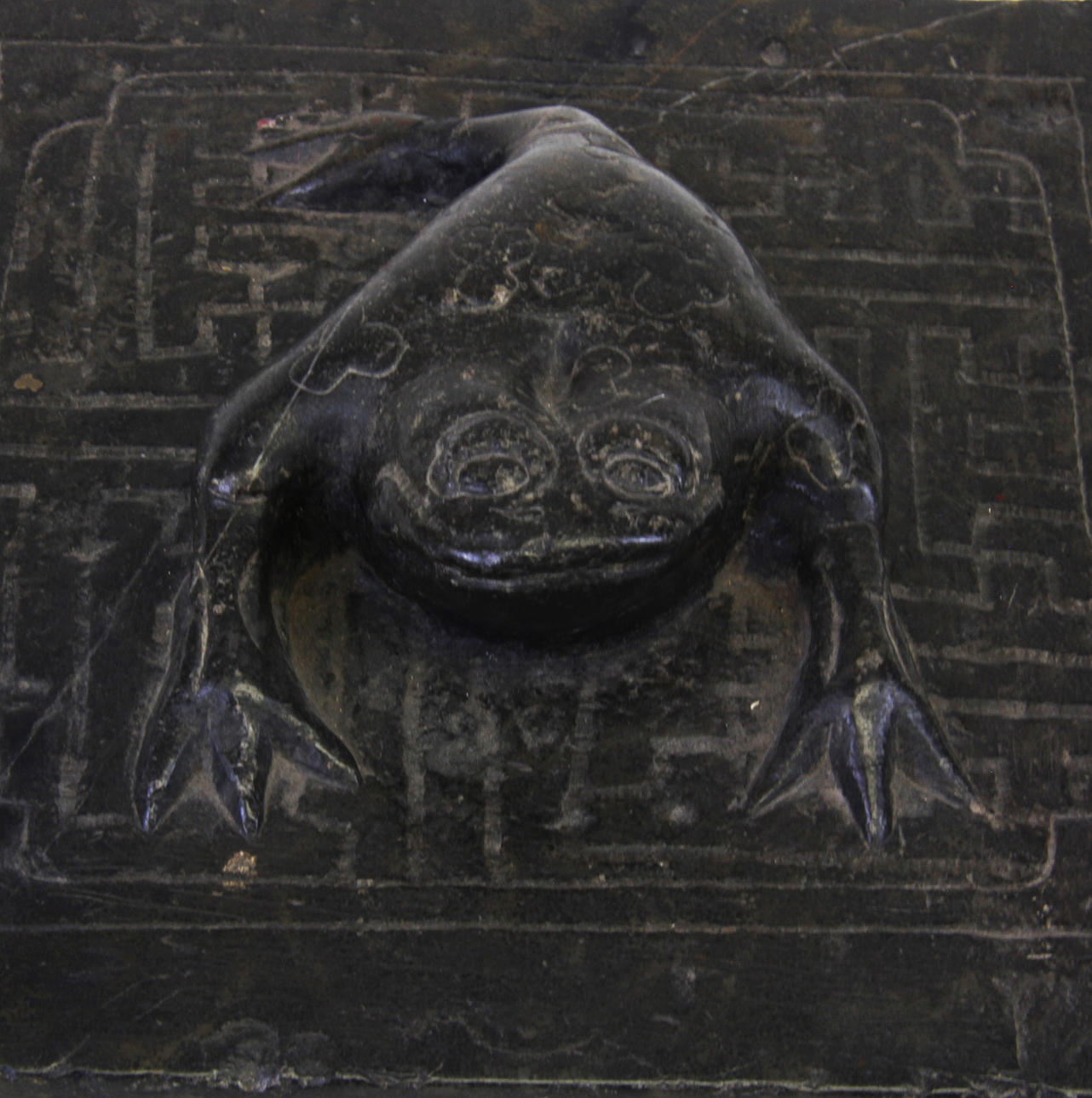 A rare Ming Dynasty (1368 to 1644) artist or scholars weight for rice paper decorated with a three legged toad, 24 x 24 x 7cm.
