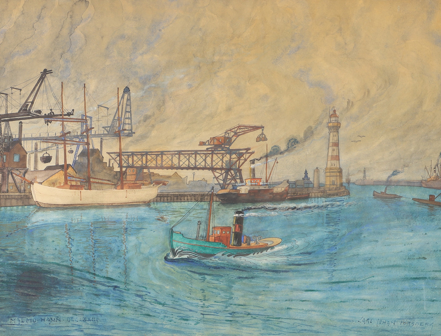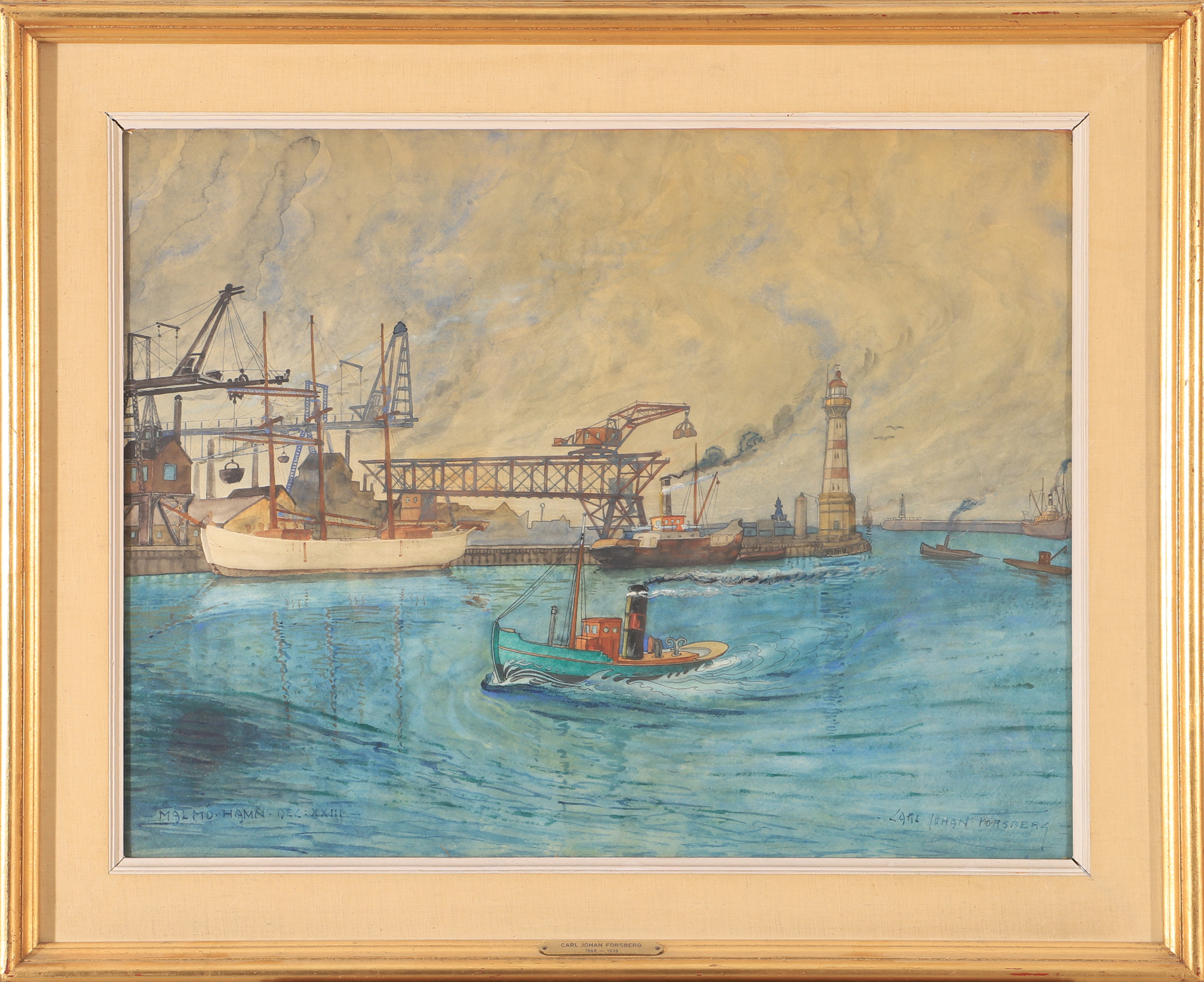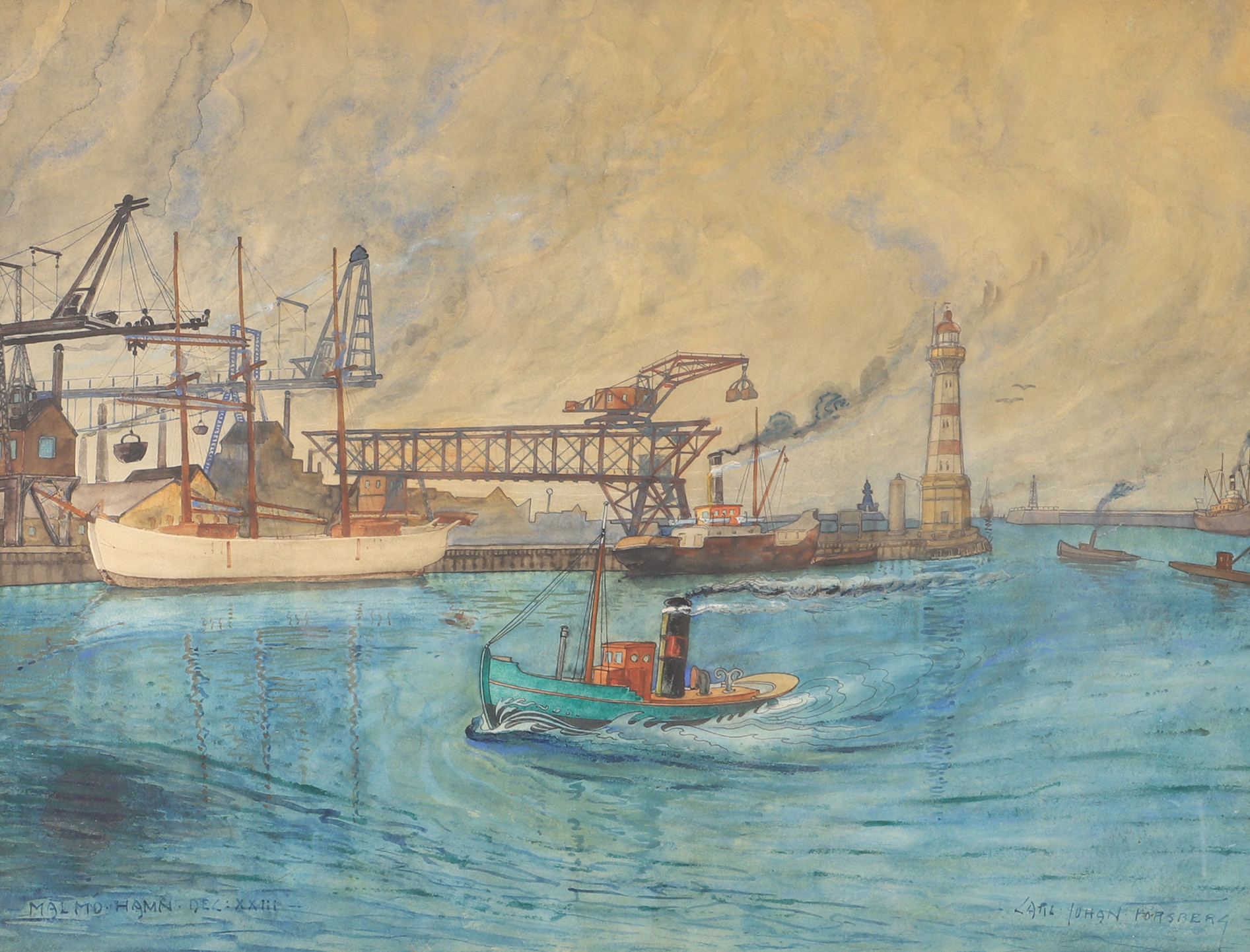 2426600. CARL JOHAN FORSBERG. "Malmö harbor", mixed media, signed.