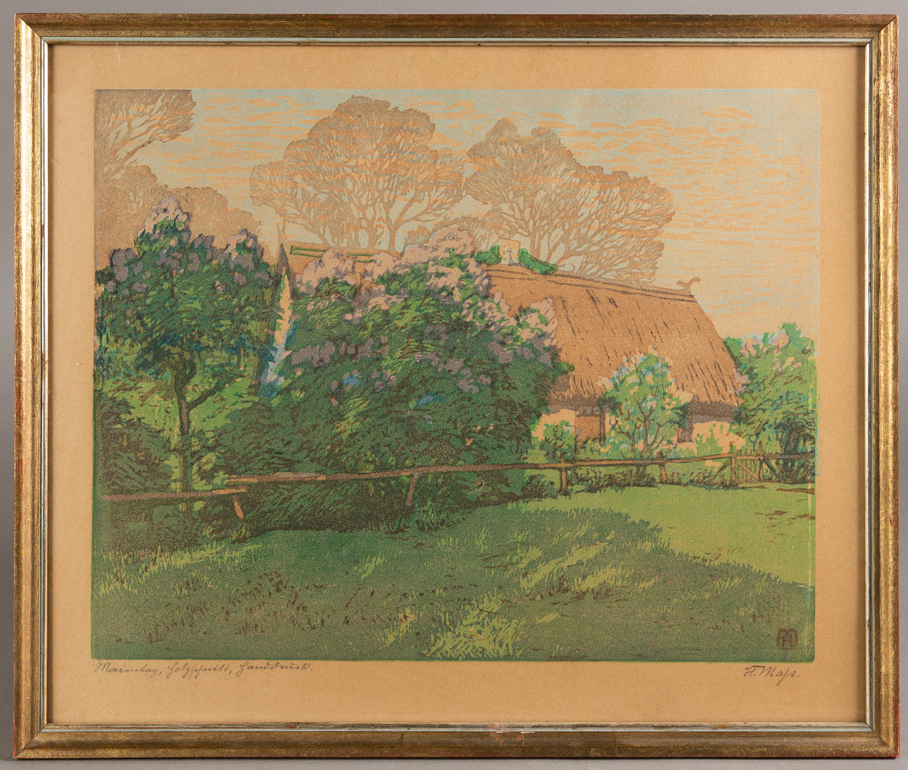 Helene Mass (1871-1955), Maientag, color woodcut, signed, titled and inscribed 'Holzschnitt, Handdruck', monogrammed in the stock, approx. 35 x 44.5 cm, framed behind glass, with frame approx. 46x54 cm.