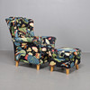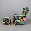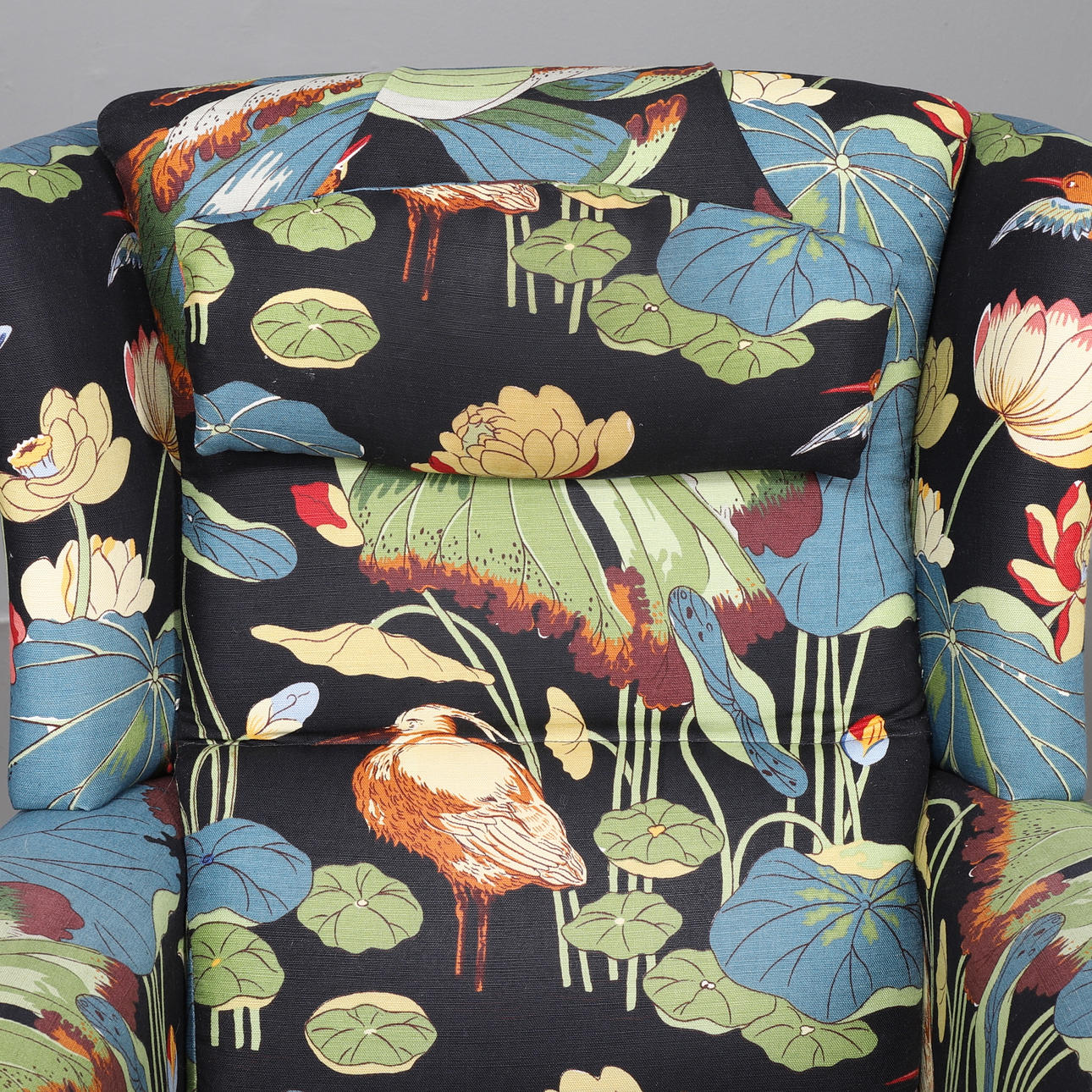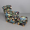 Fully upholstered armchair with folding backrest and accompanying footstool. curved legs in book. Loose neck pillow.
