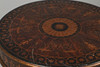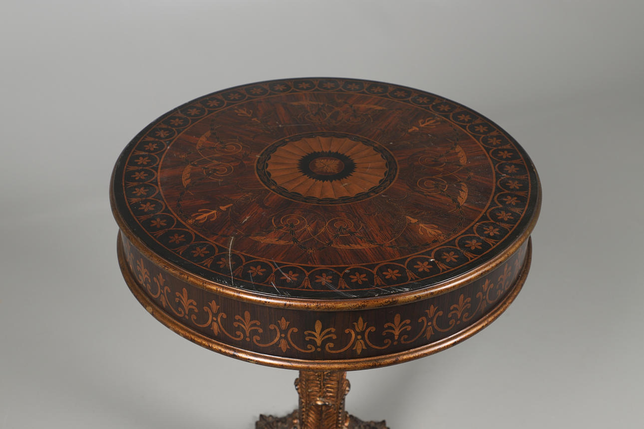 A decorative occasional table Featuring imitation ornate inlay and wood effect styling (made of a resin and foam like material). Height 68cm x Diameter of top 56cm.