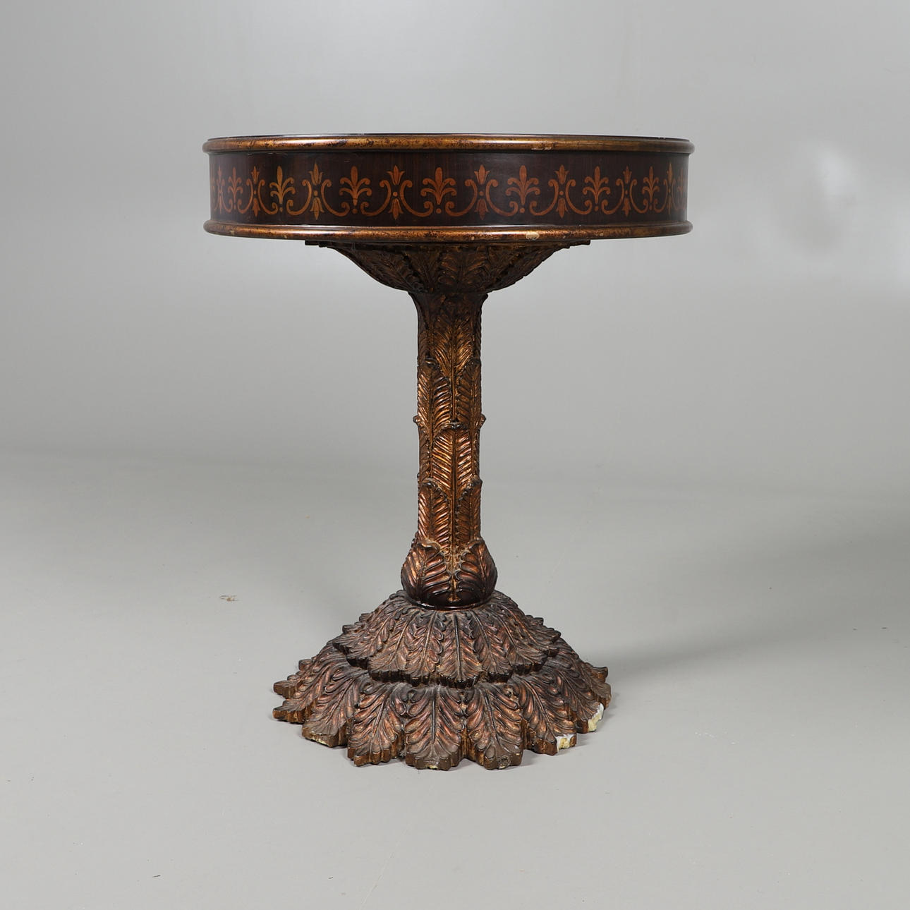 A CIRCULAR OCCASIONAL TABLE ON A LEAF EFFECT BASE/COLLUM.