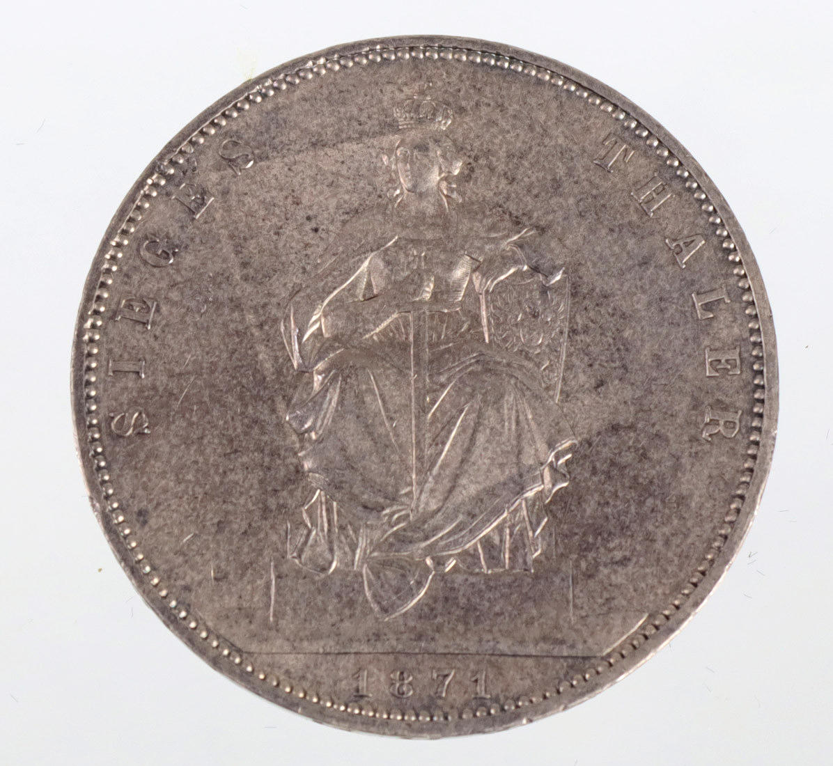 Silver, Wilhelm Koenig von Preussen 1871 A, verso Germania with sword and shield and inscription *Sieges Thaler*, edge inscription *Gott mit Uns*, Ø approx. 33 mm, weight approx. 18.5 grams.