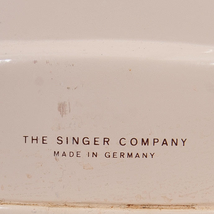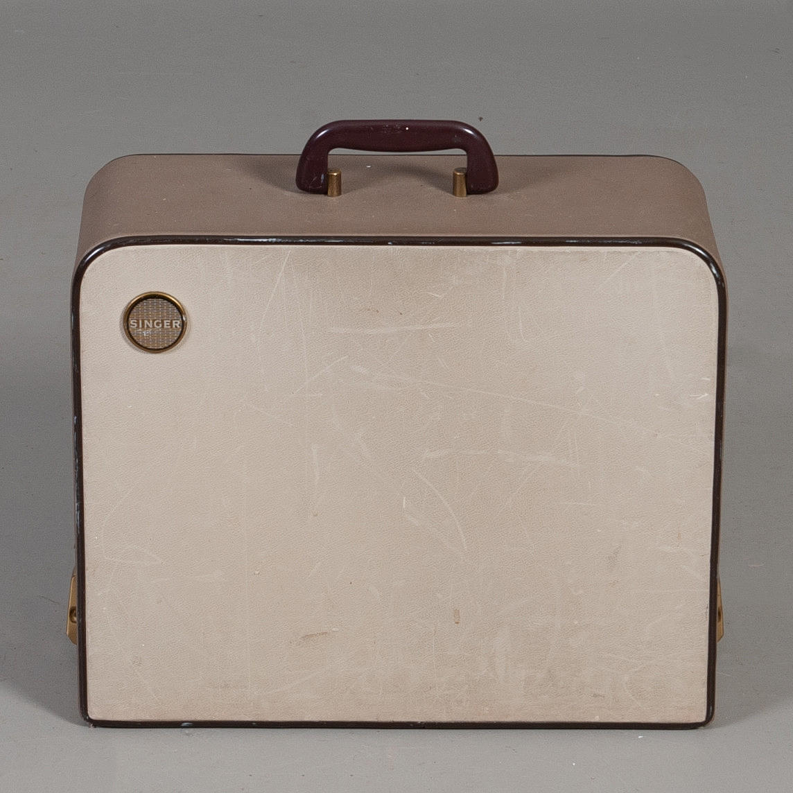 Nougat colored sewing machine from Singer with hood.