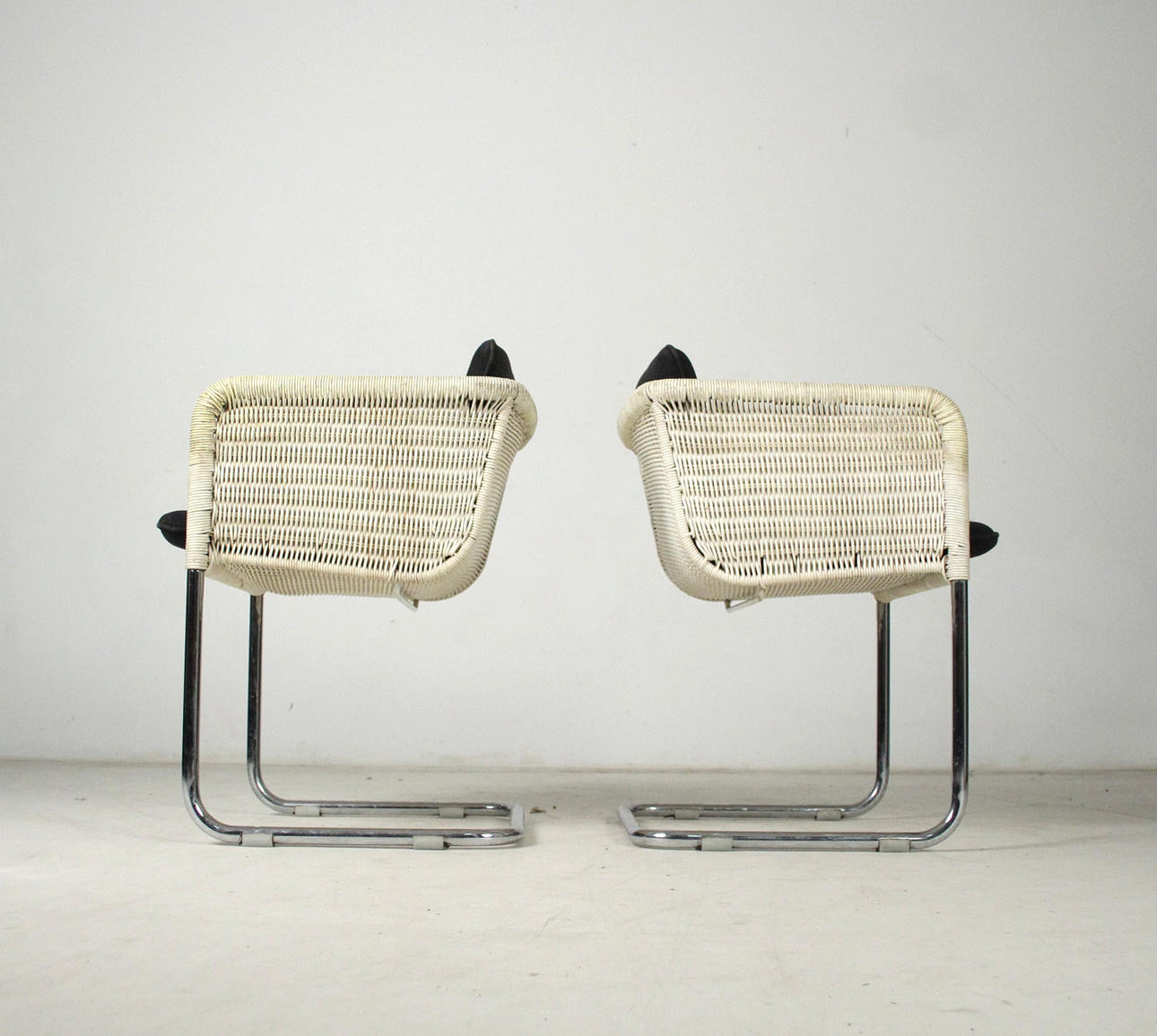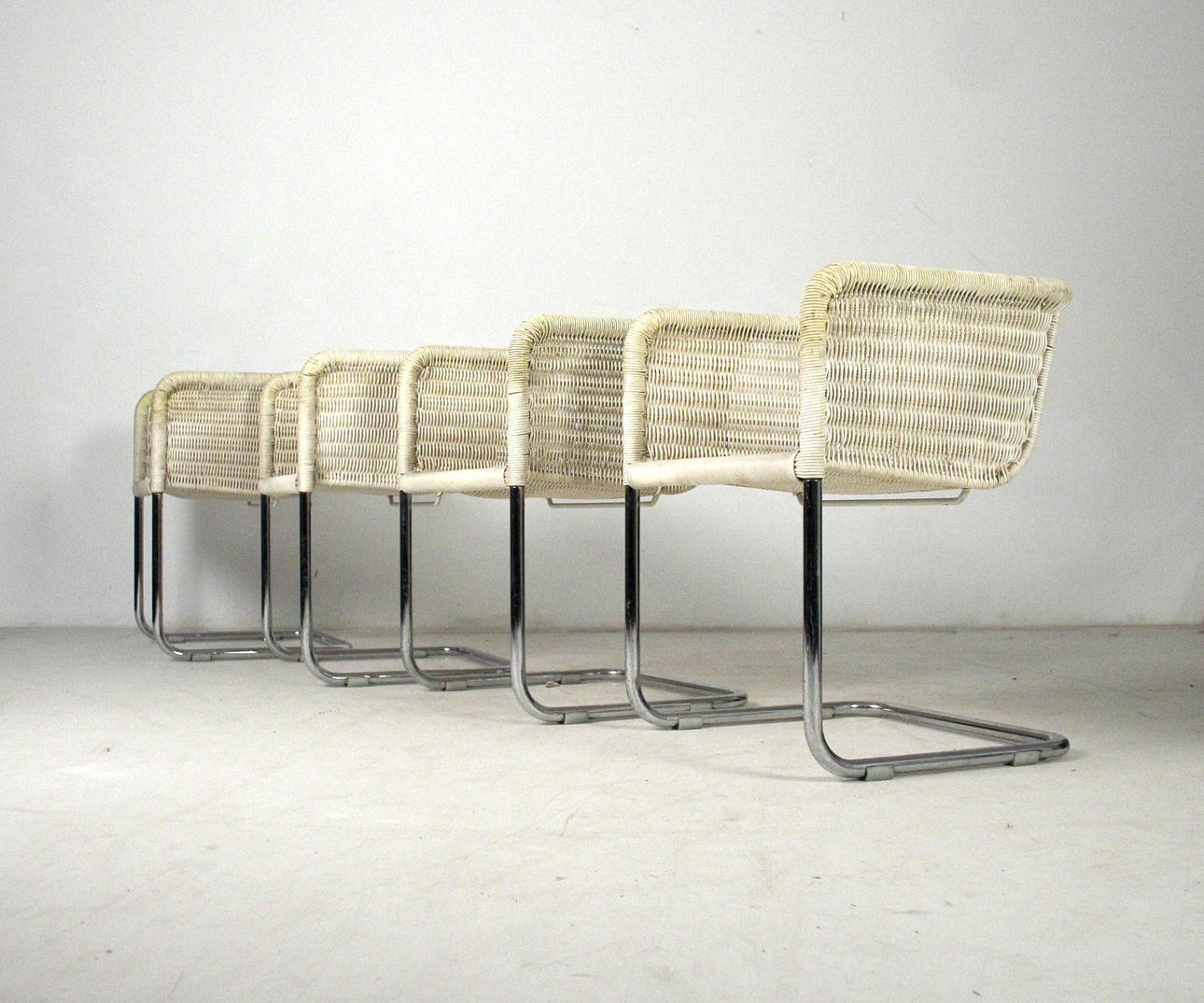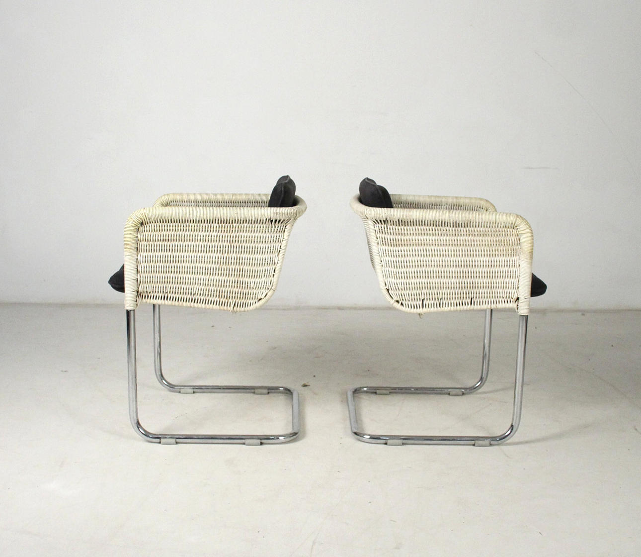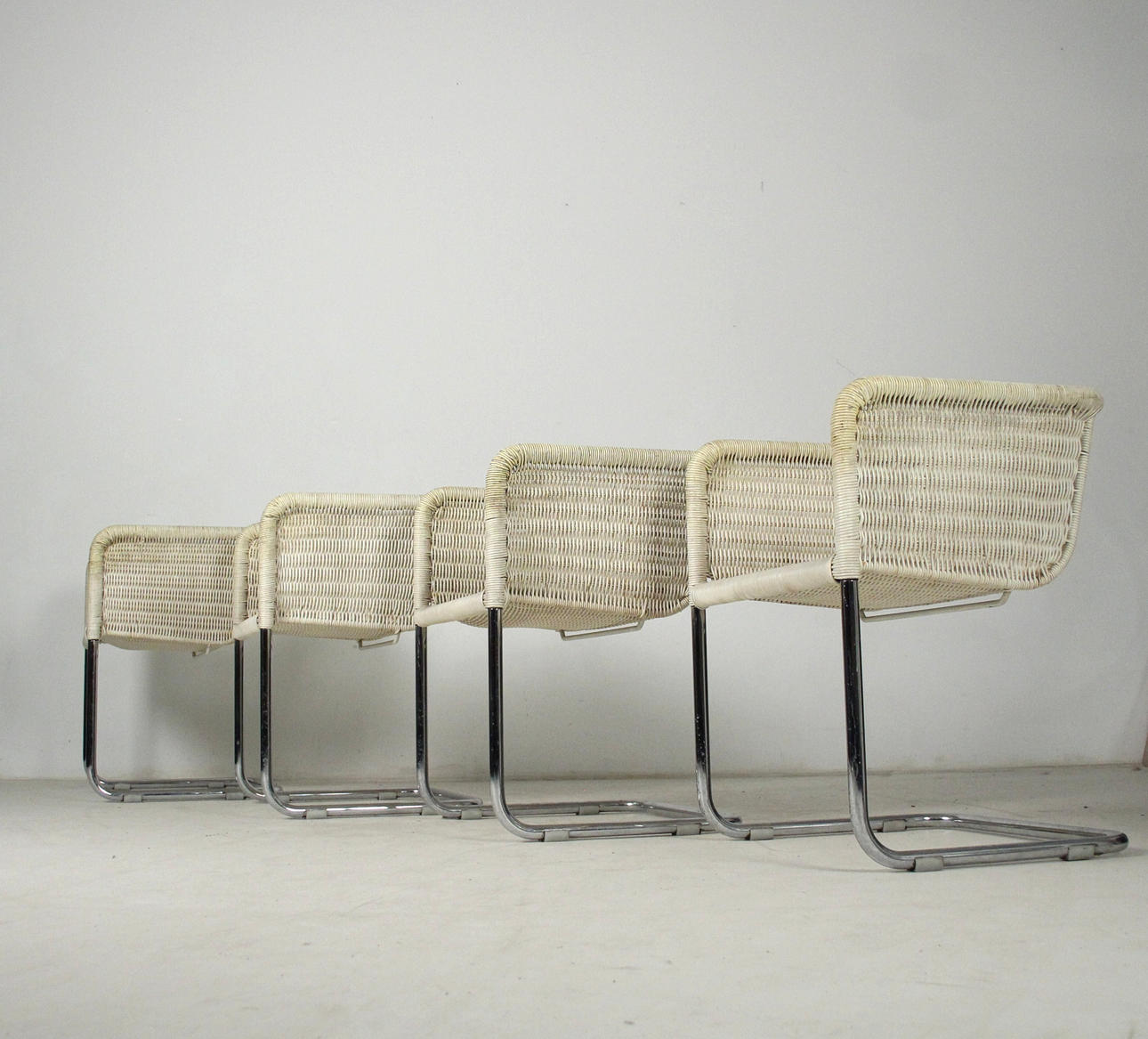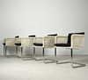 Tecta D43 - Cantilever chairs/armchairs. Construction made of light-colored mesh and chrome-plated frames. Seat cushions with gray covers. H. 68.5cm, W. 55cm, D. 53cm.