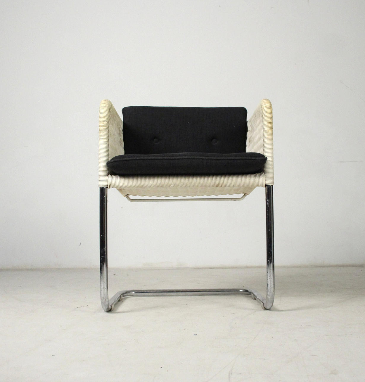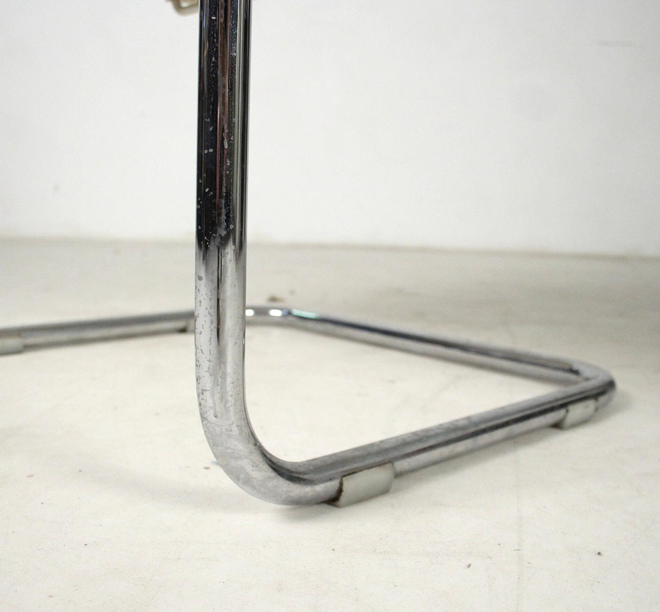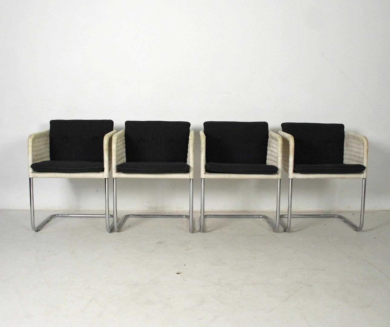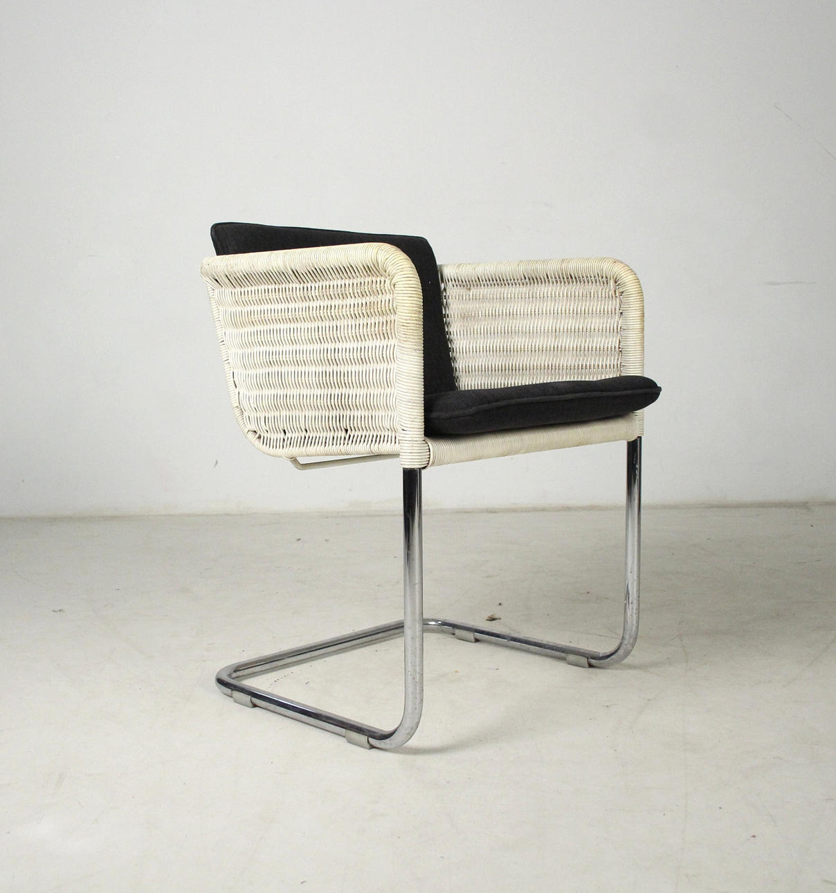 Tecta D43 - Cantilever chairs/armchairs. Construction made of light-colored mesh and chrome-plated frames. Seat cushions with gray covers. H. 68.5cm, W. 55cm, D. 53cm.