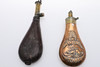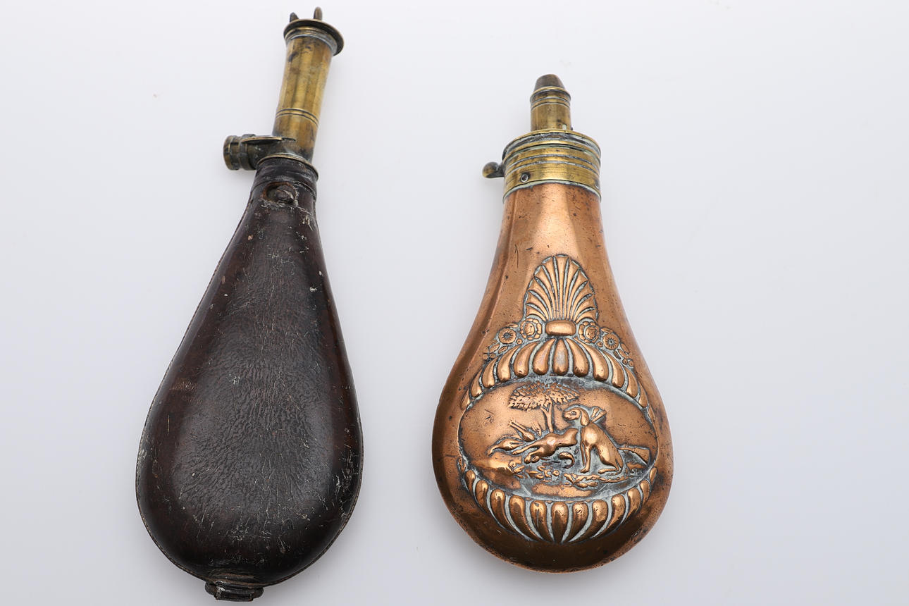 Cooper flask -surface marks and dings. Leather flask - surface wear to leather, flask containing shot (?).