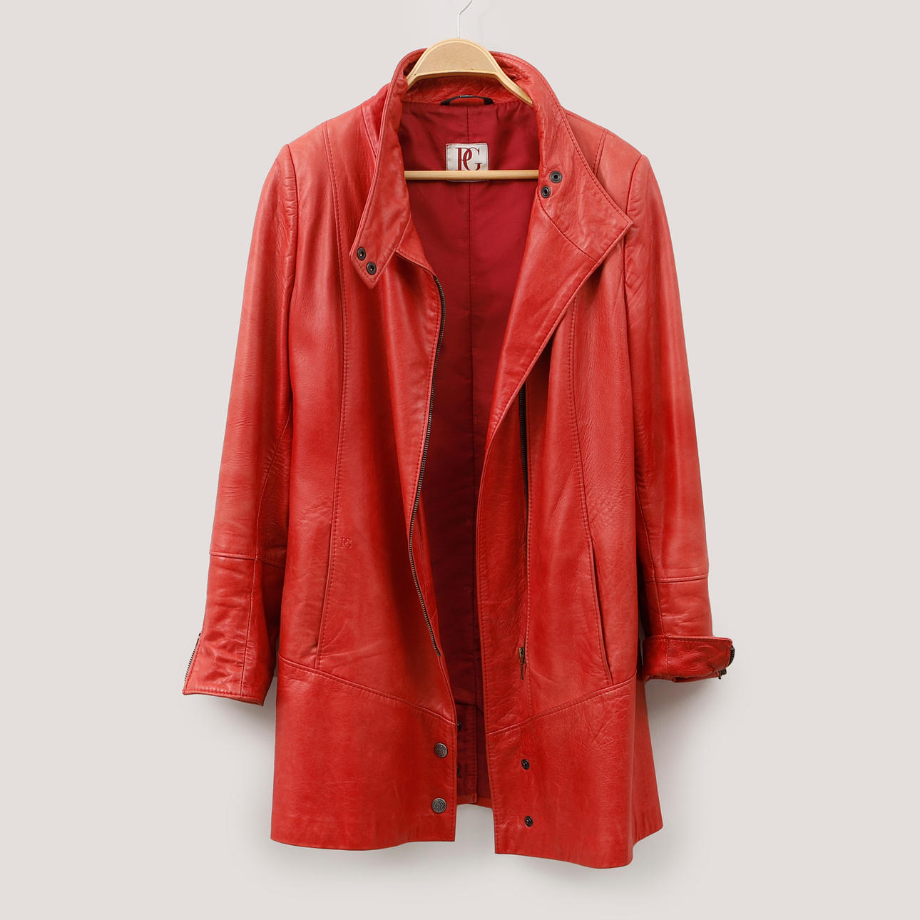 Coat in red leather. Bust width 96 cm. Back length 83 cm.