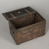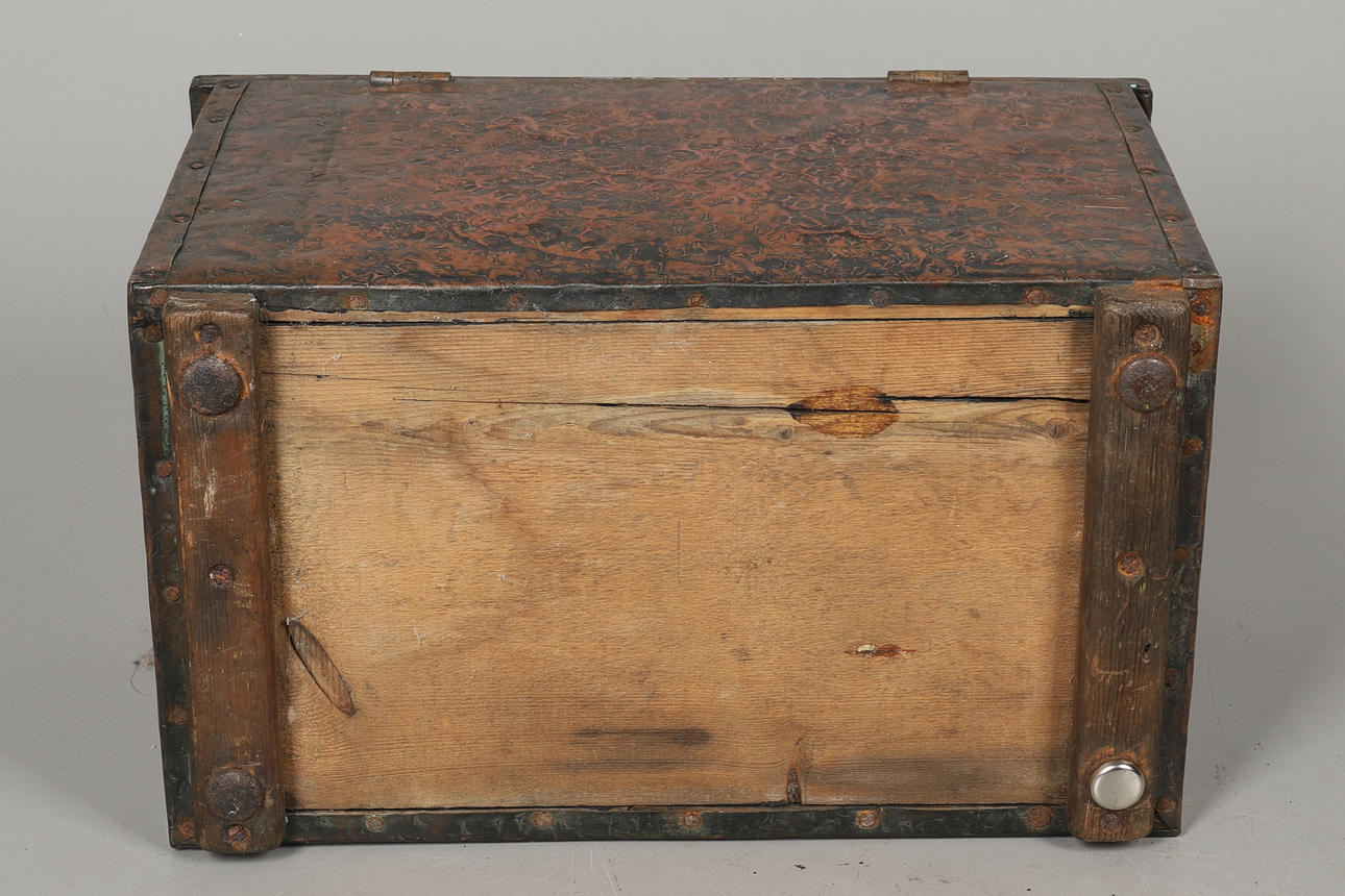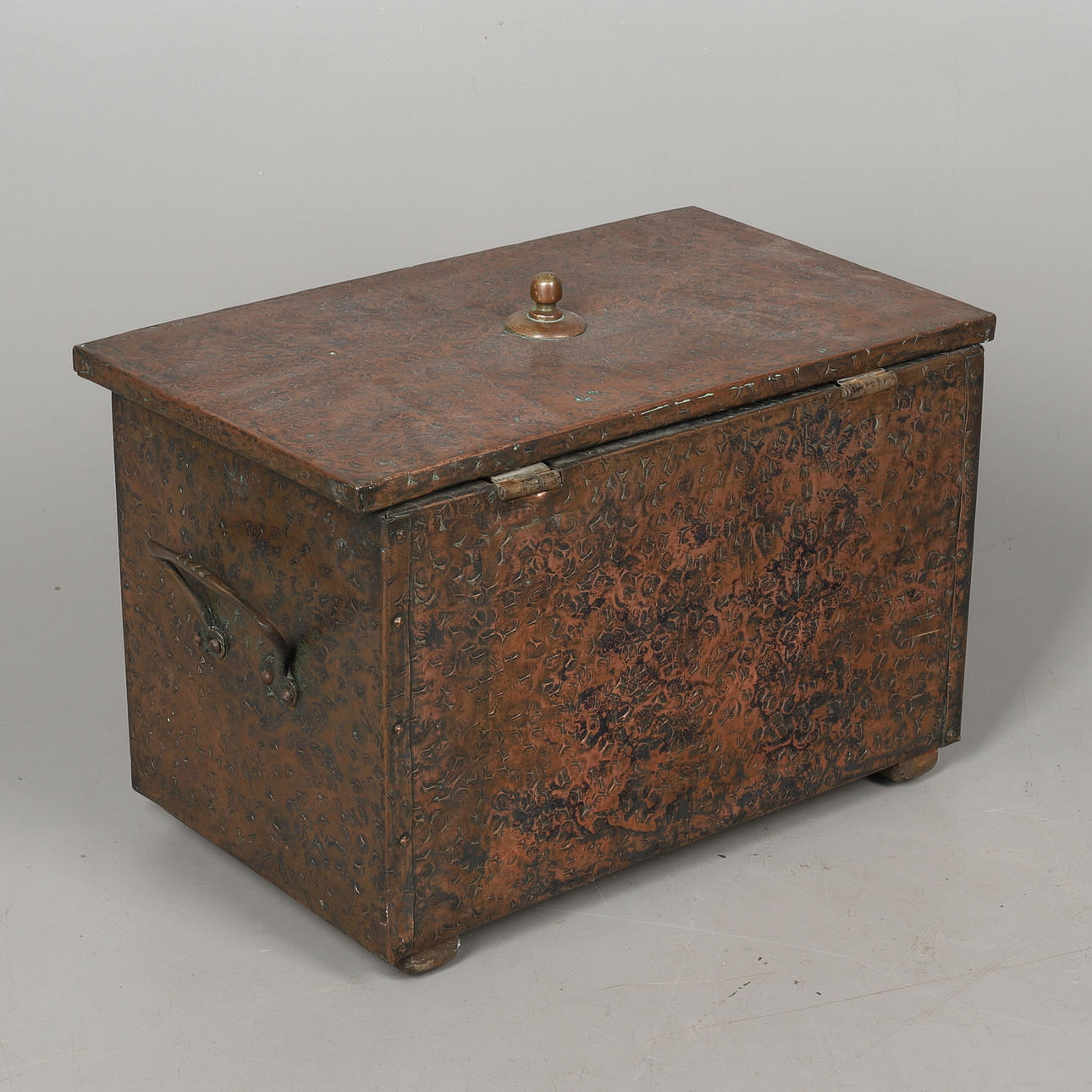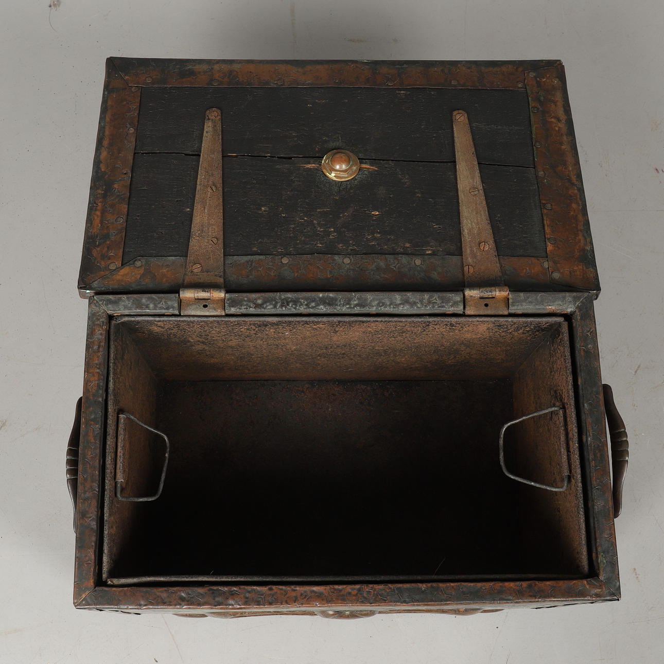 rectangular with hinged lid, two side handles, on four bun feet, removable metal liner top 45.5cm x 27.5cm, 30cm maximum height.