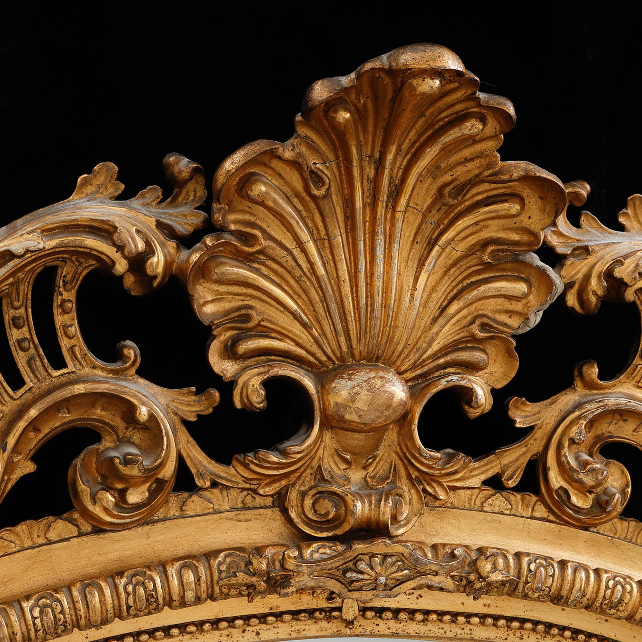 Oval mirror crowned with rocaille. About 123 x 125 cm.