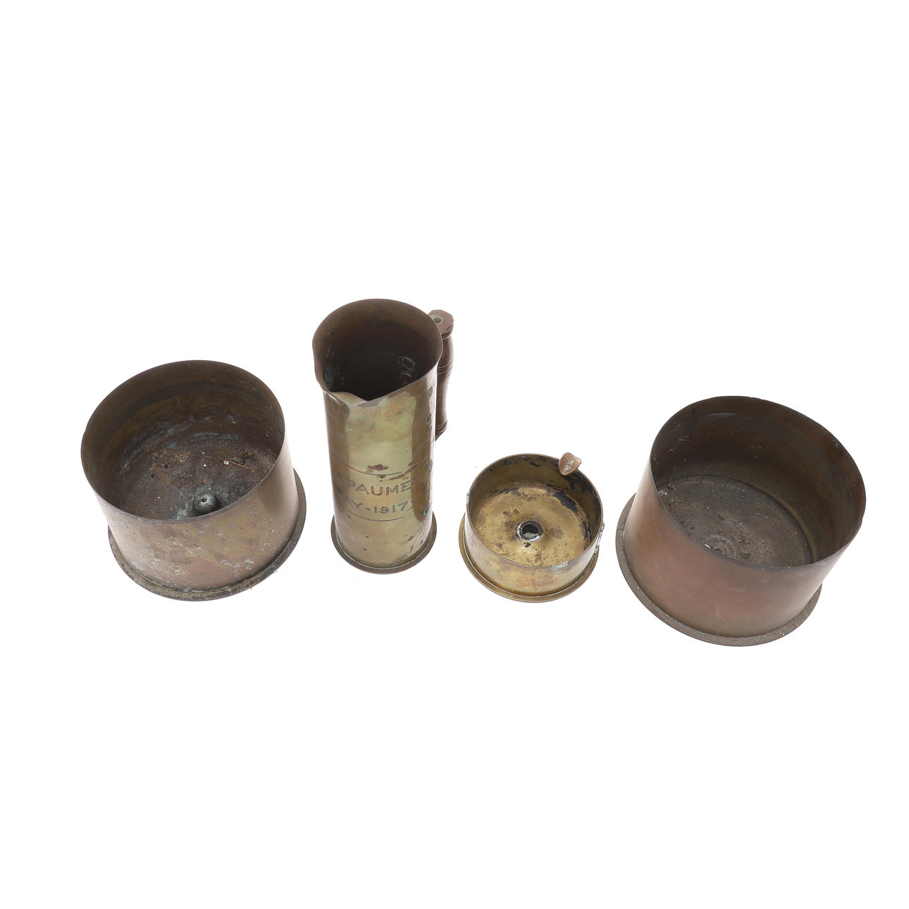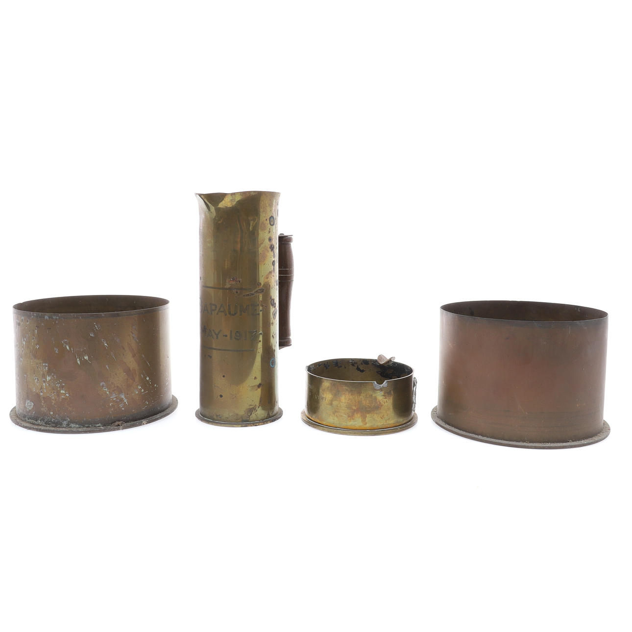 one stamped 'Polte Mai 1916 Magdeburg, 17cm diameter x 11cm high, another, dated Jan 1917, adapted as a jug, with a wood and copper mounted handle, 23cm high, and inscribed 'Bapaume May - 1917', and another, dated 1961, adapted as an ashtray, applied with a Royal Horse Artillery crest and inscribed, 12cm diameter (4)