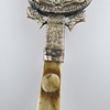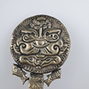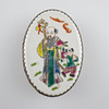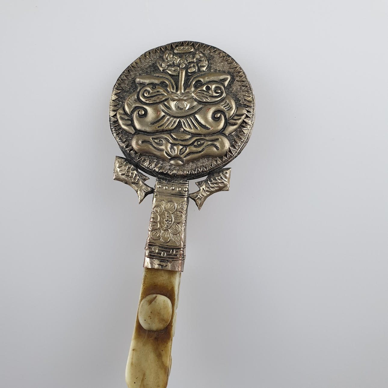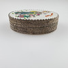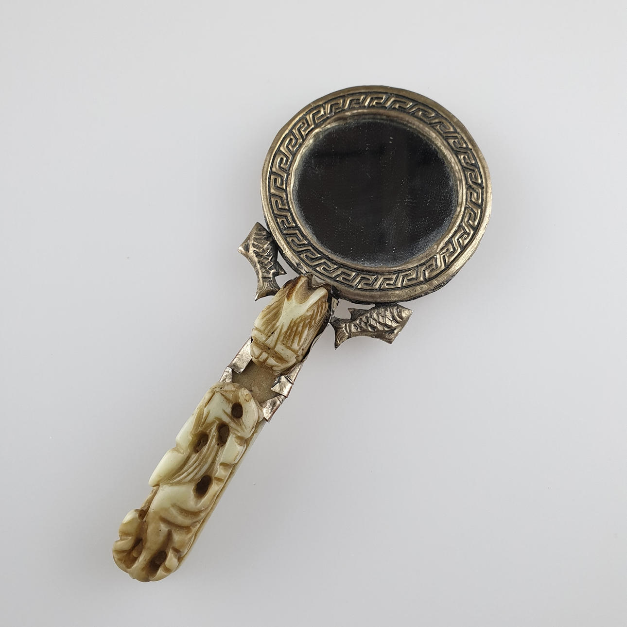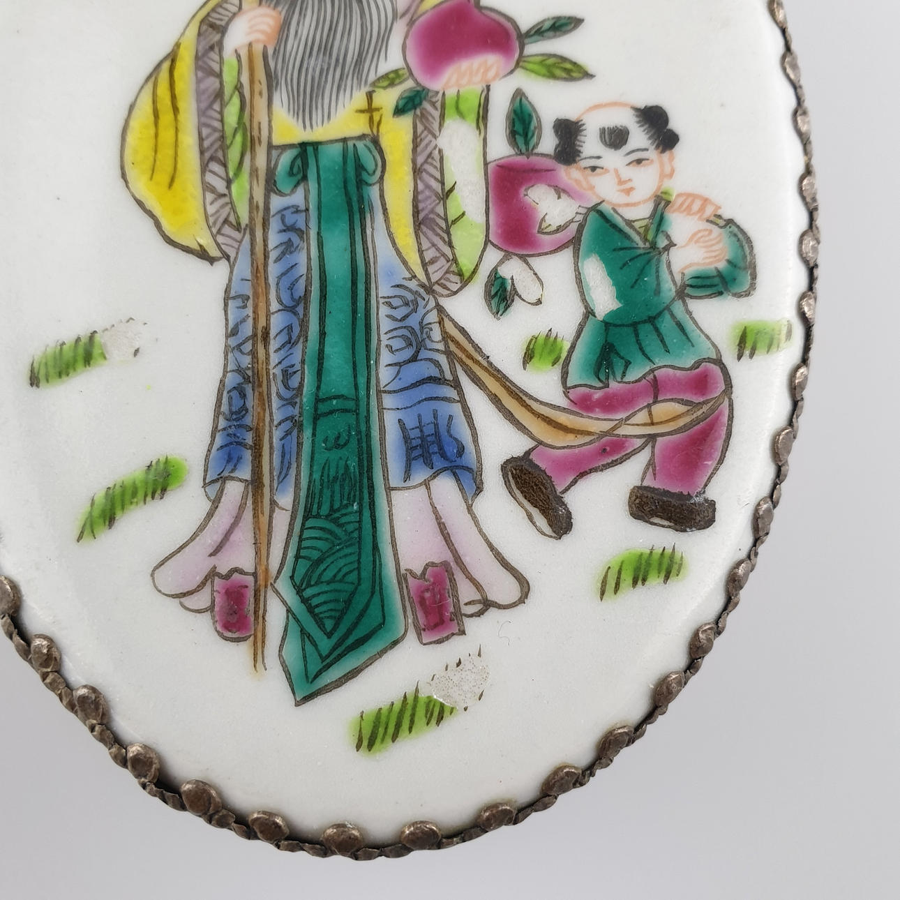 oval metal box with porcelain plaque in the lid, immortals painted on it, mirrored inside, approx. 2.5x9.5cm, round mirror with decorated metal frame and carved soapstone handle, L.approx. 14 cm.