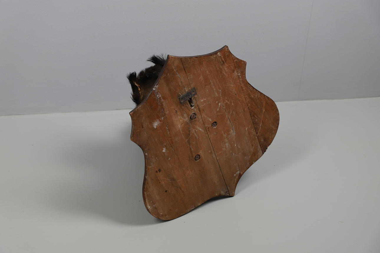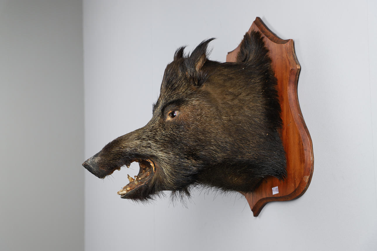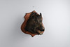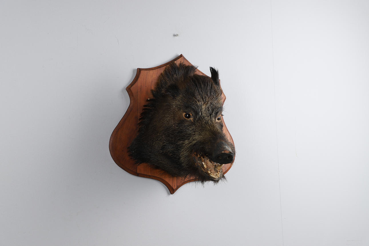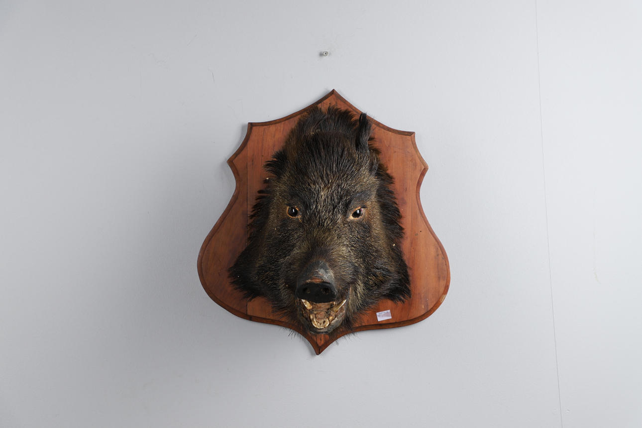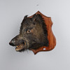 A boars head on a wooden mount. Mounting board measurement: Length 51cm x width 48cm. Can be wall mounted.