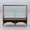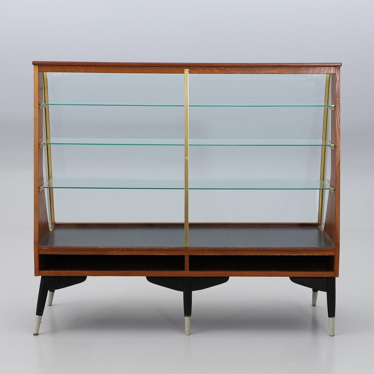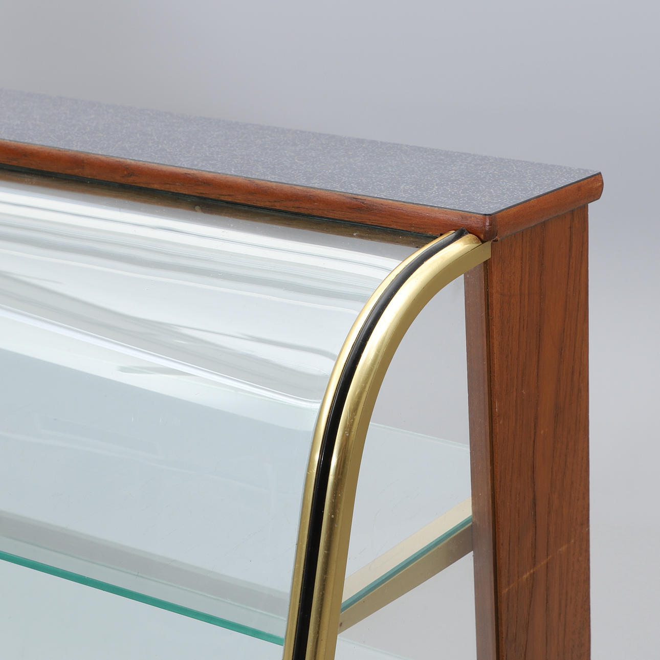 Teak veneered. Front with arched glass, glazed sides. Interior with three glass shelves. Black laminated bottom plate. Back/inside with shelf. Black lacquered legs. Length 151, depth 56, height 135 cm.