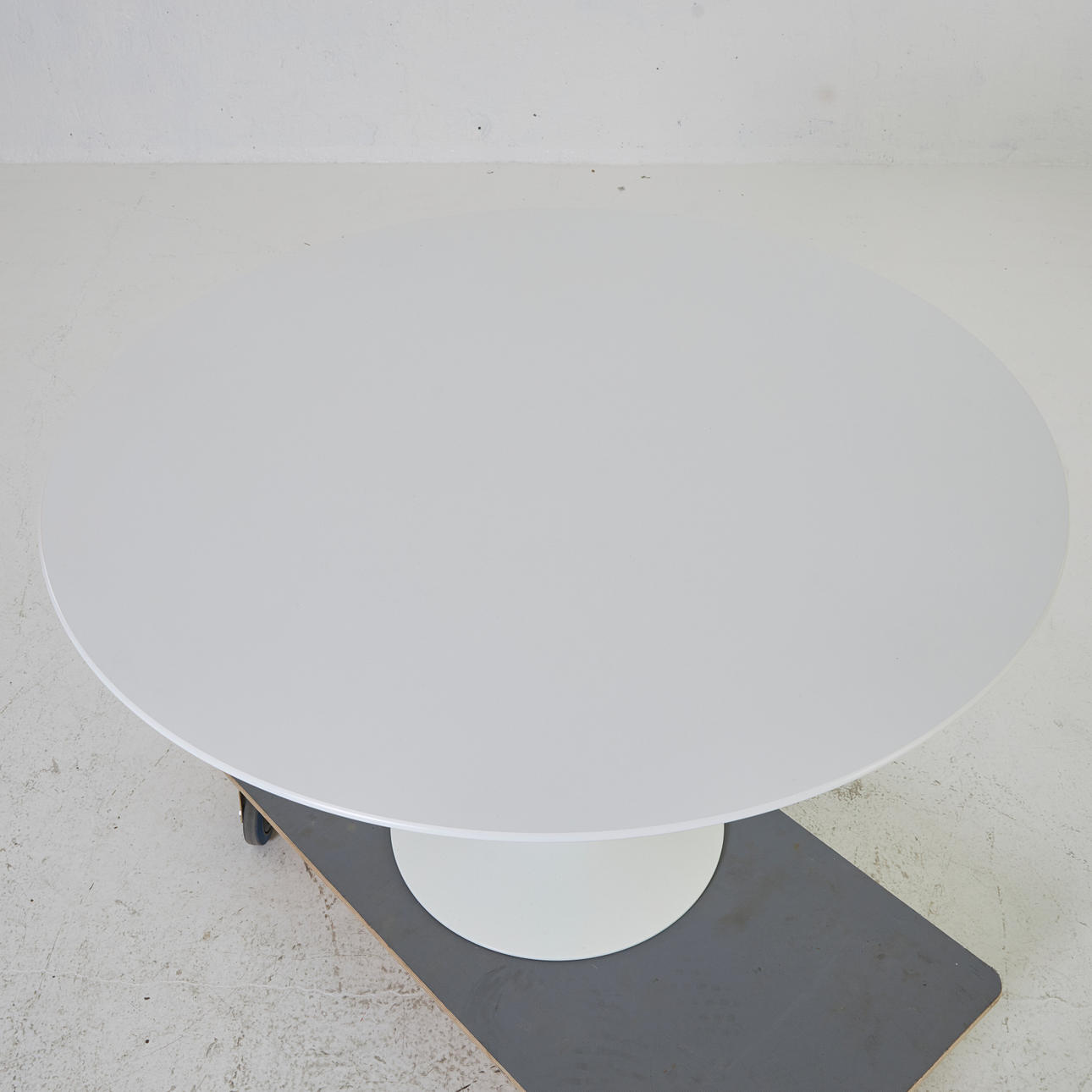 Column base in painted, cast aluminum and a table top in a round design. Laminate board.