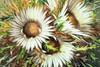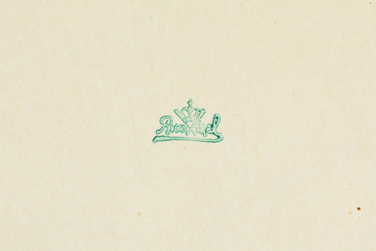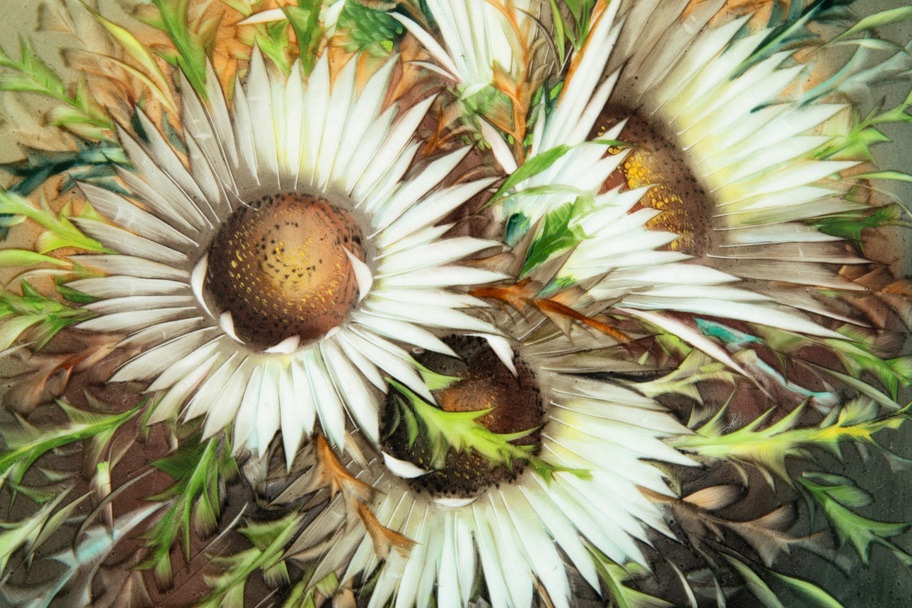 'Silver Thistles'. Porcelain, colored and glazed in a gilded wooden frame. 42 cm x 36.5 cm x 6 cm (frame)/ 30 cm x 24 cm (plate). Marked on the back with a green stamp: Rosenthal company brand. Printed signature in white lower right.