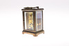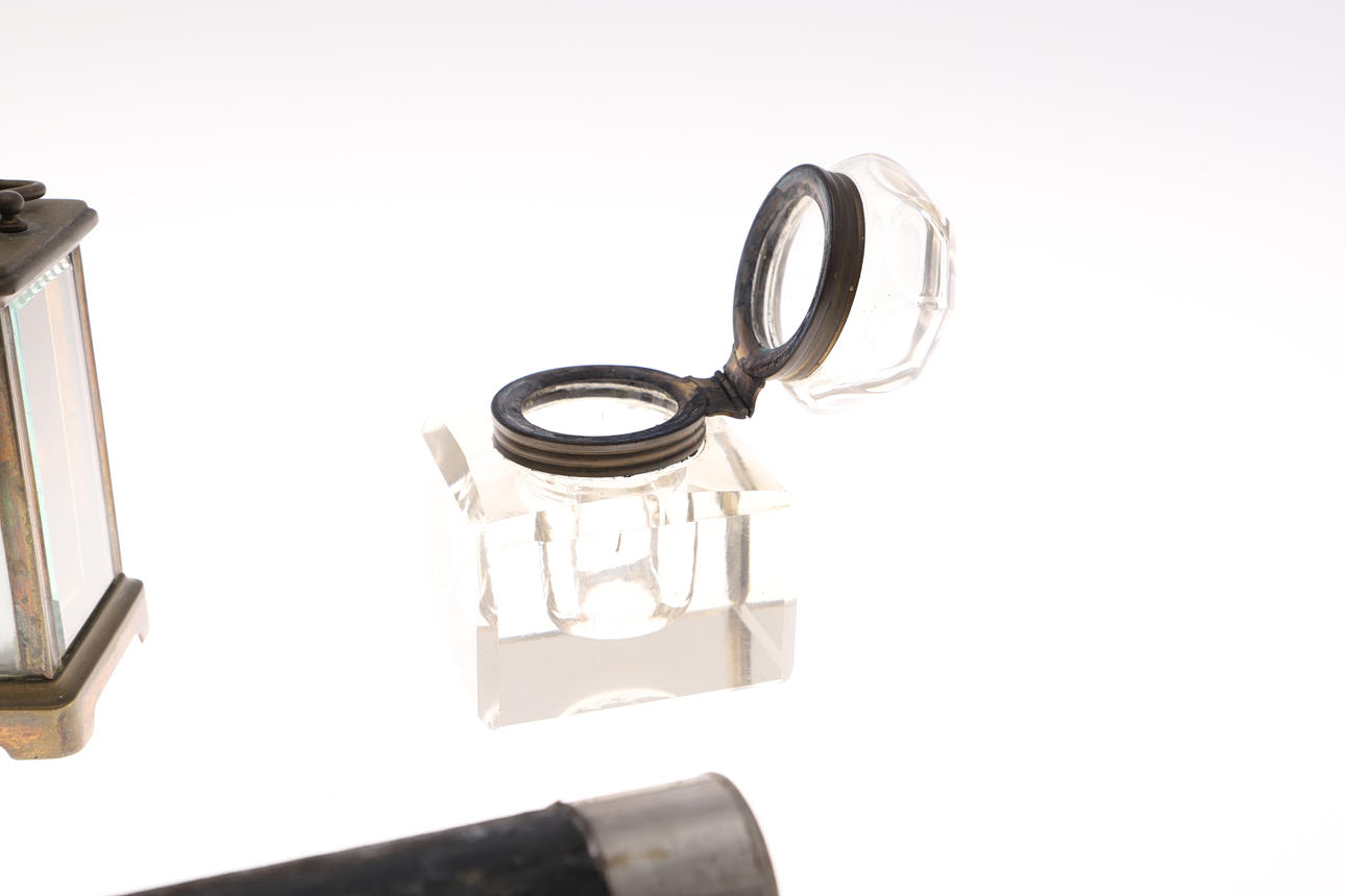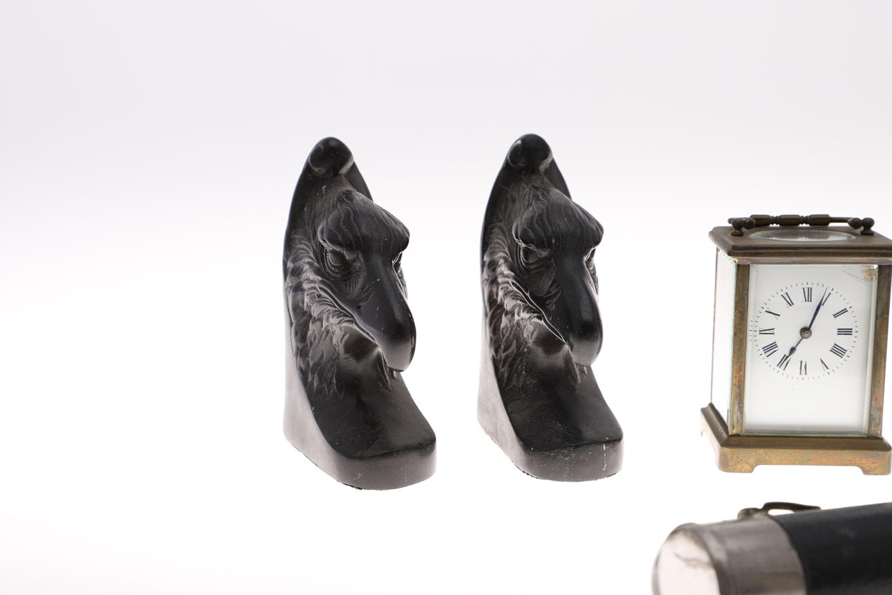 inscribed O & O Ltd, 1939, together with a brass carriage clock, large glass inkwell, 10cm high, and a small pair of metal eagle's head bookends.