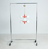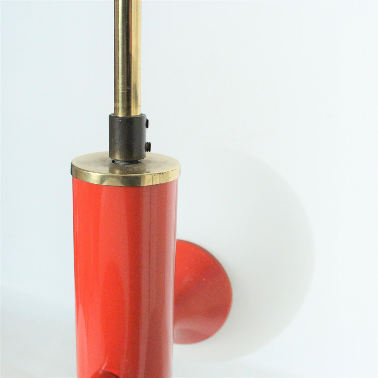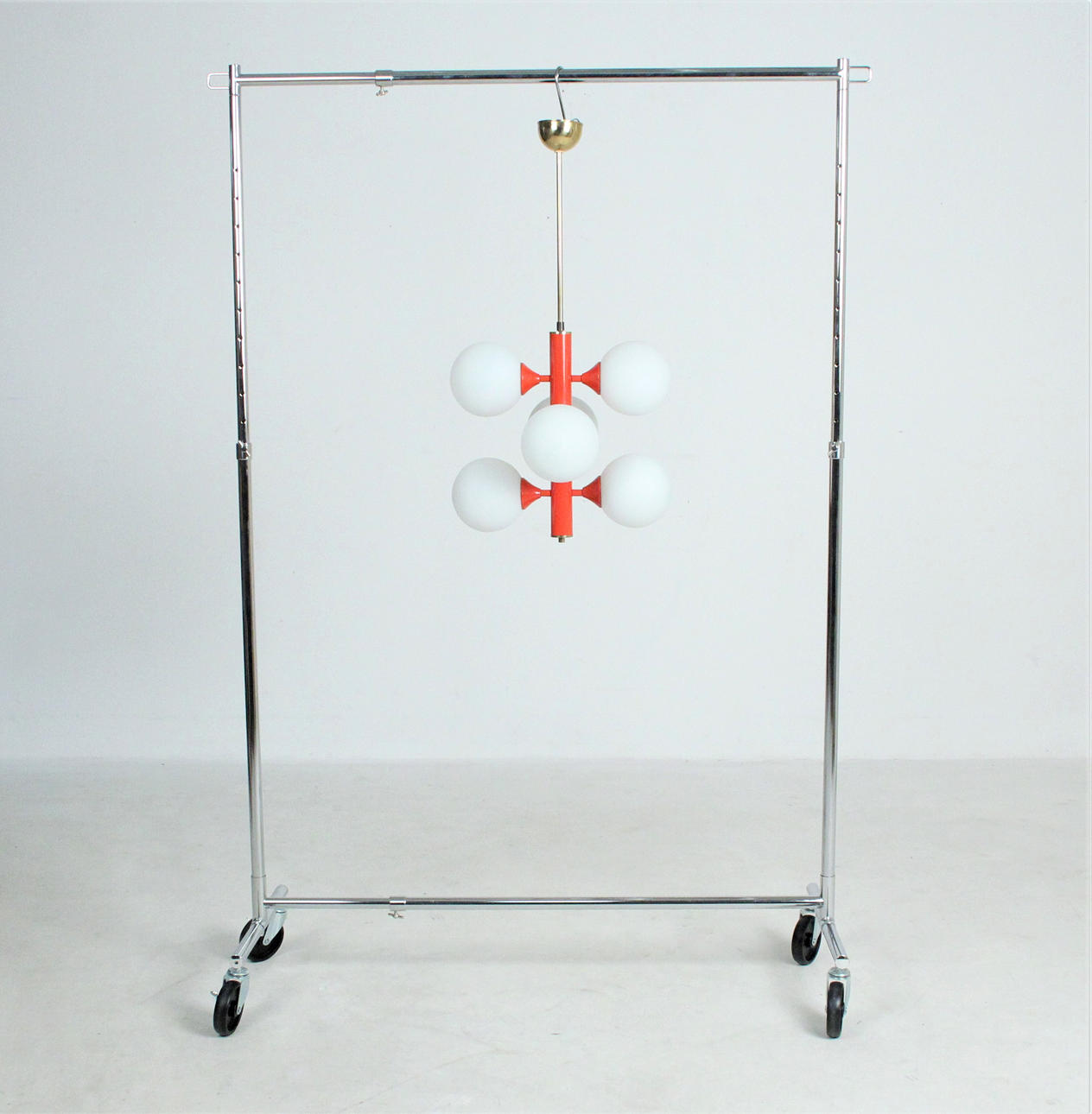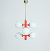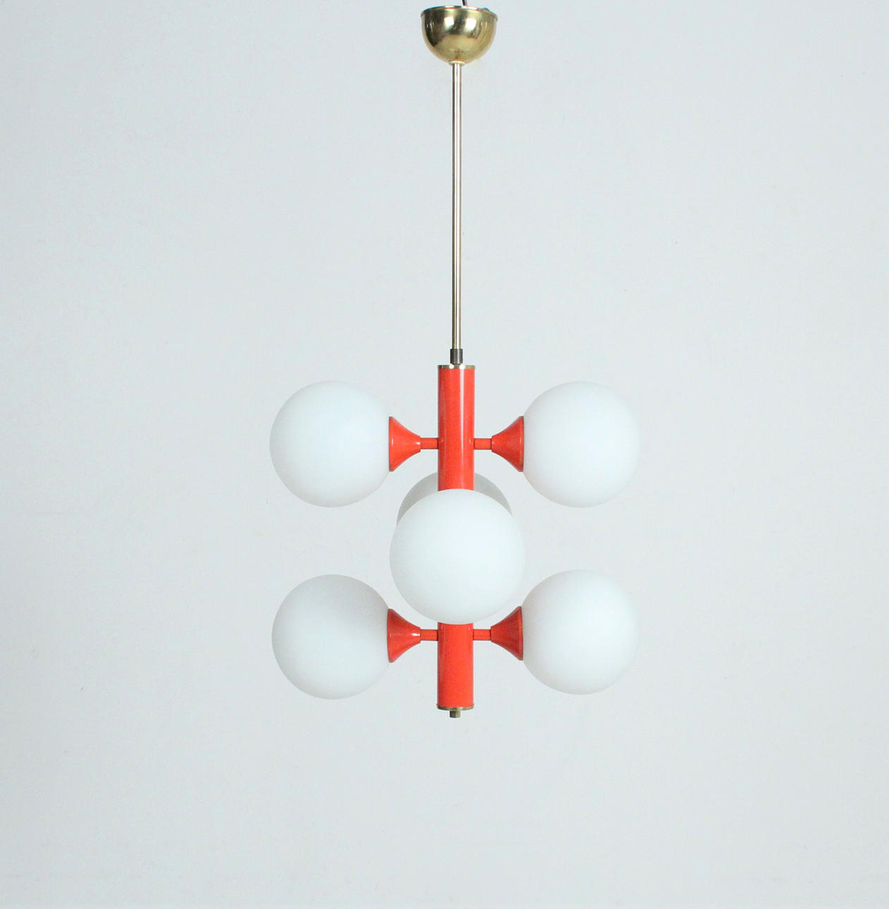 Material: brass, satined ice glass, metal painted red Dimensions: H: 75 cm, D: 40 cm.