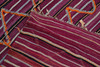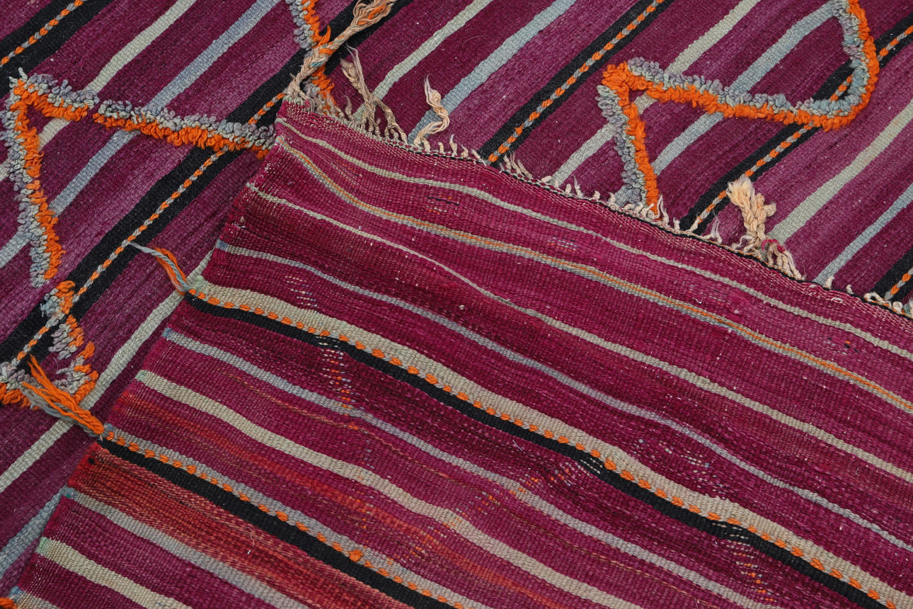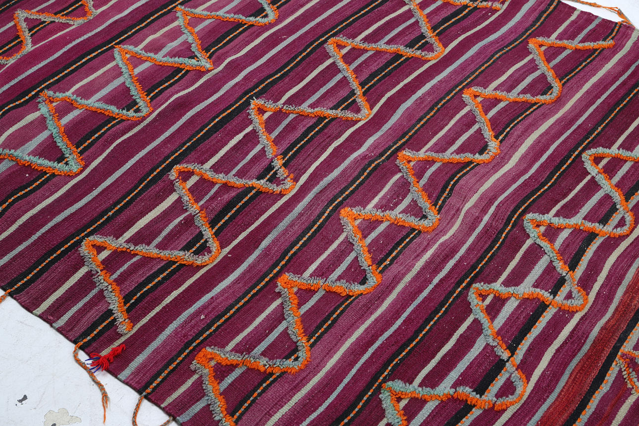 Wear, stains, small holes, uneven sides, partially missing fringes.