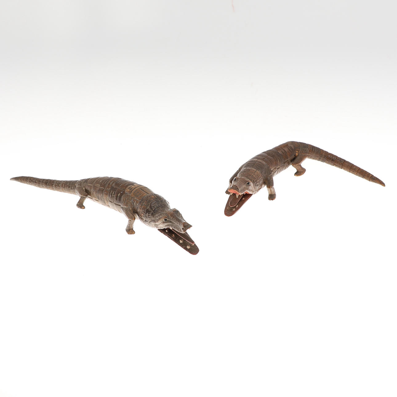 Possibly Aboriginal souvenir artefacts, the lot includes carved animals and other items as well as two articulated crocodile. The largest carved crocodile measures 54cm long.