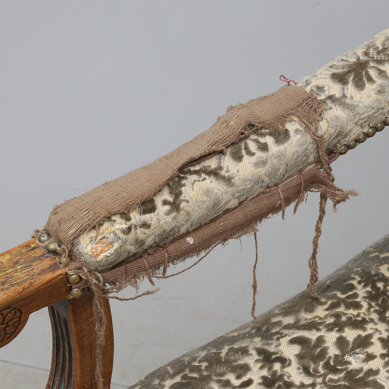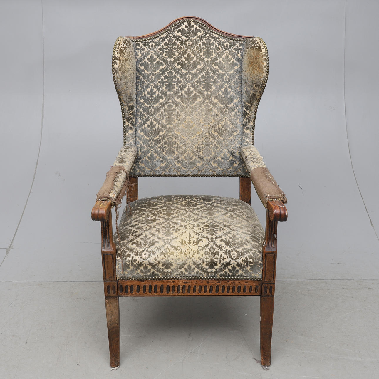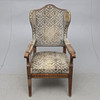Cut decor, firmly upholstered seat and back with pearl studs, upholstered armrests.