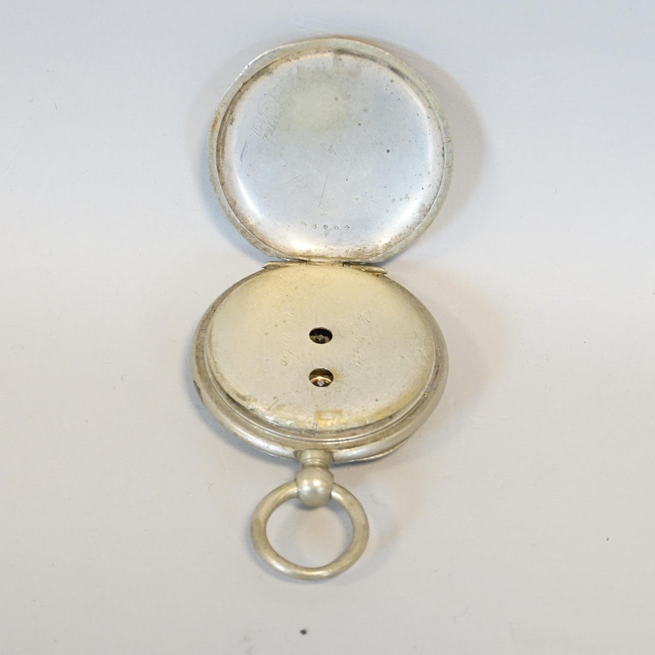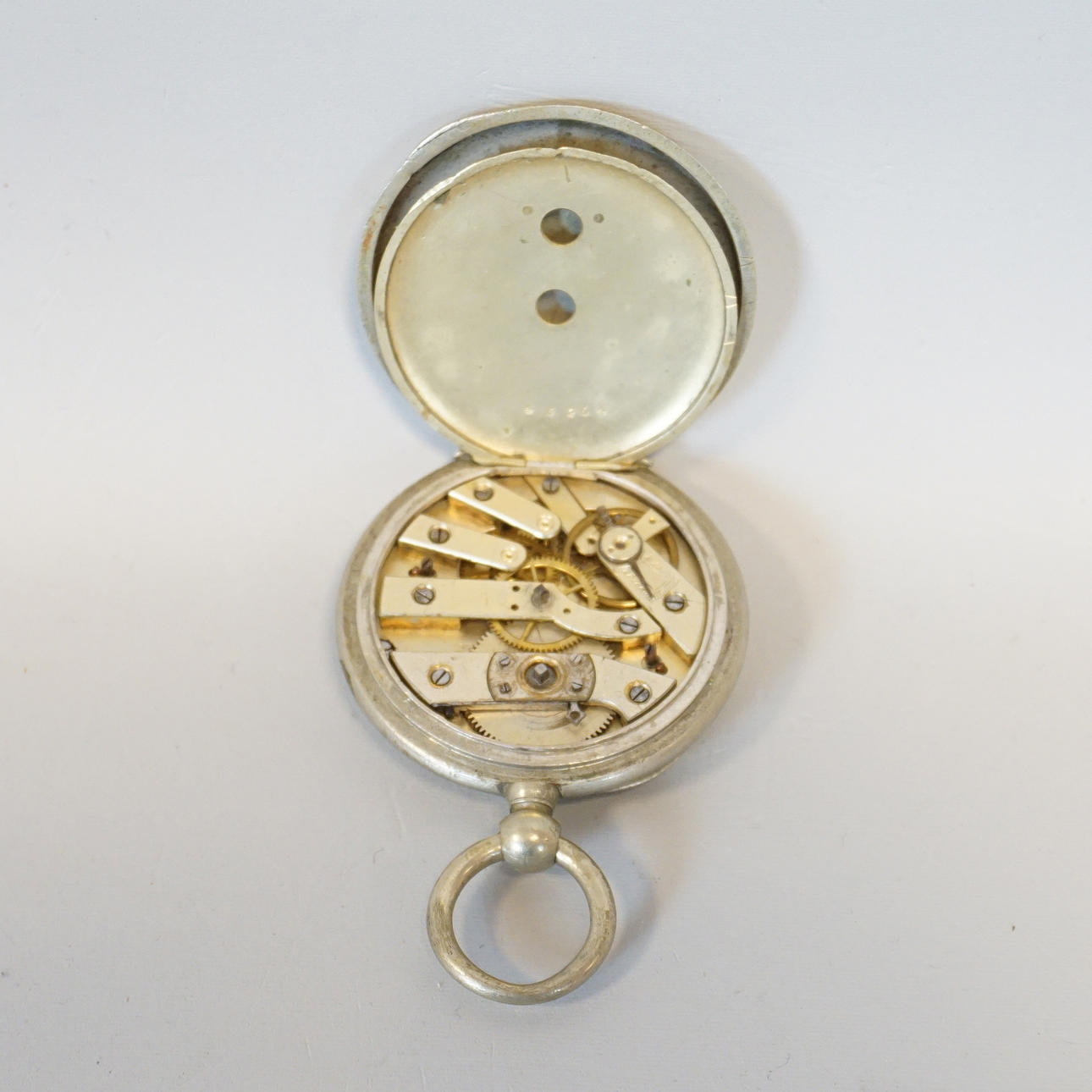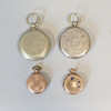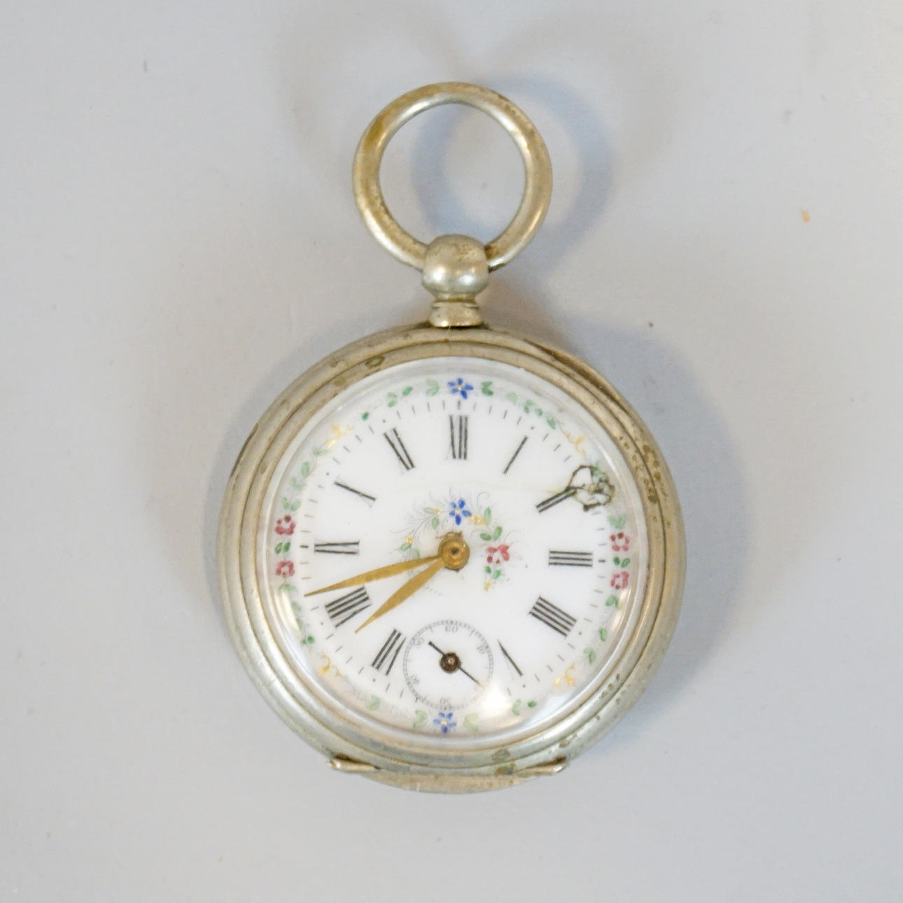 Pocket watch, metal, dial with painted decoration of flowers, diam 4.5 cm. Keychain Pocket watch, outer case in silver, anchor. Diam 4.5 cm Women's pocket watch, double/metal with flower decoration on the back. Diam 2.8 cm Women's pocket watch, double/metal, diam 2.8 cm.
