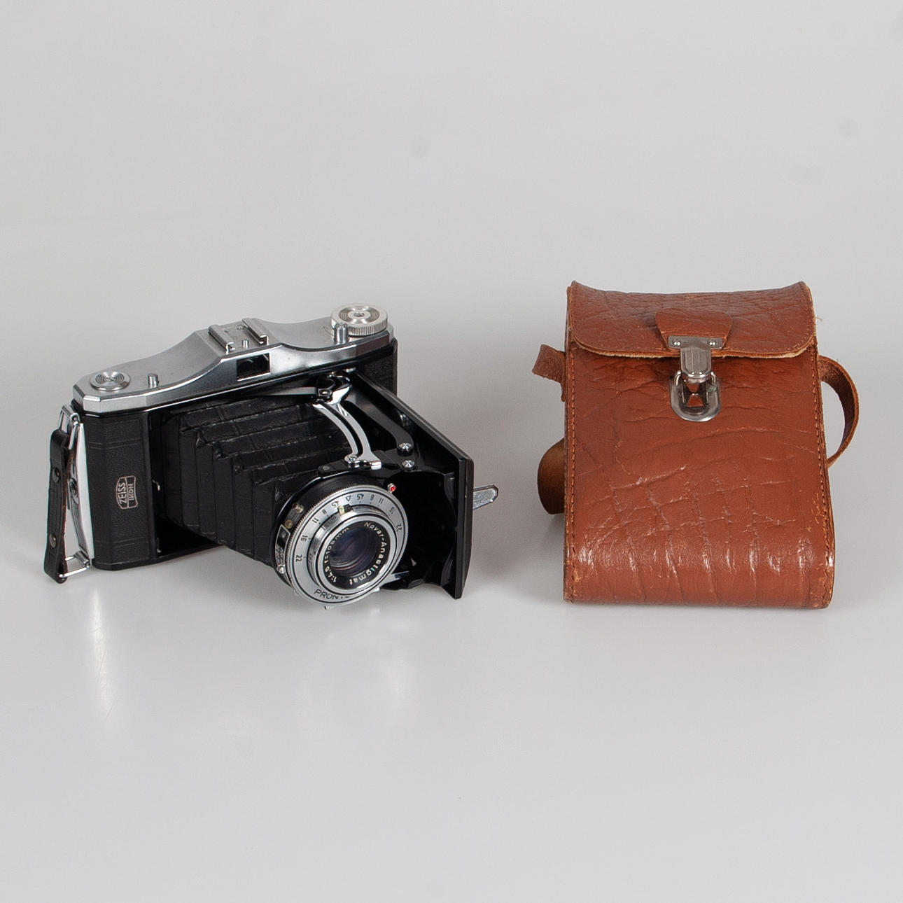 With fixed optics: Novar-Anastigmat 1:4.5 f=105mm mounted in PRONTO shutter. Includes leather carrying case.