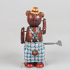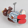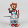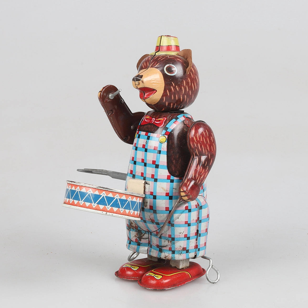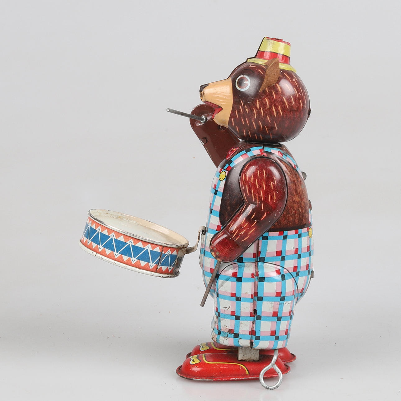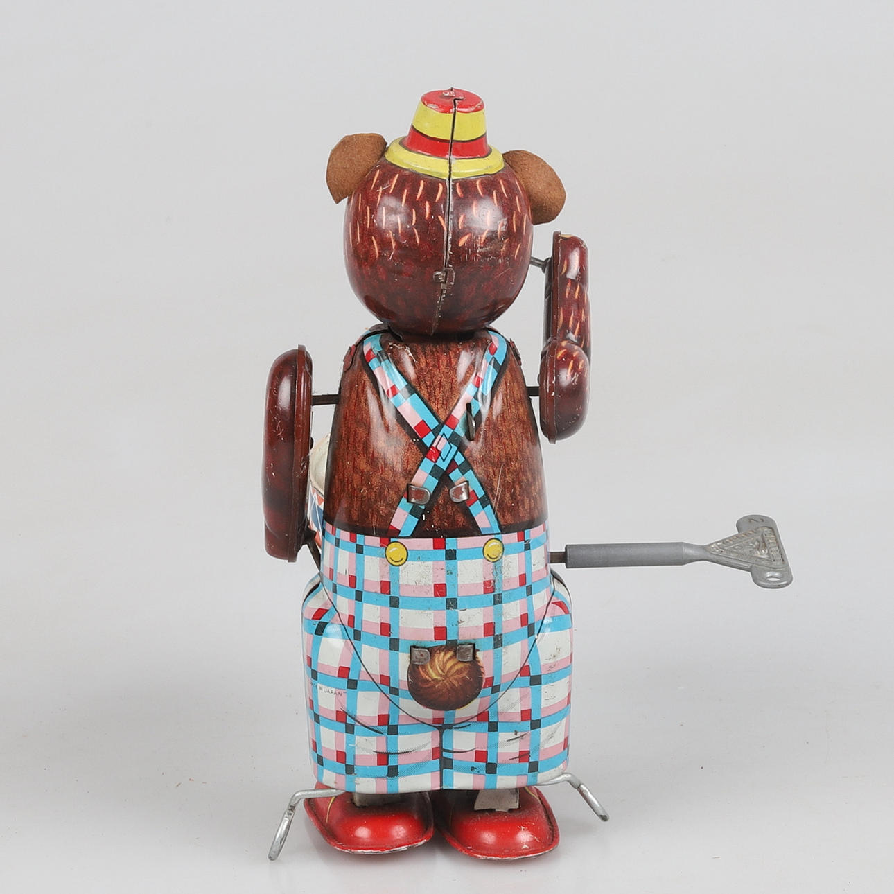Drumming bear in lithographed sheet metal, spring-operated with key function. Marked Made in Japan.