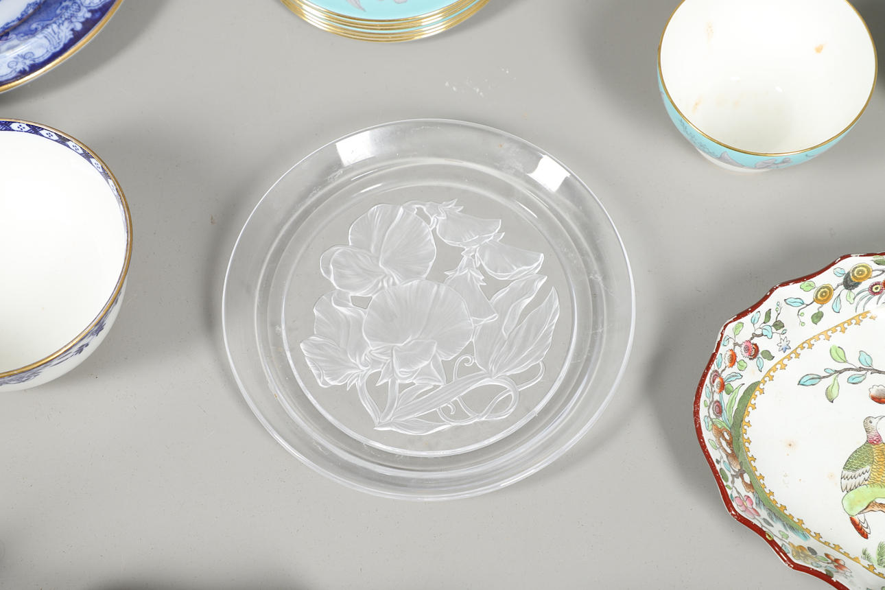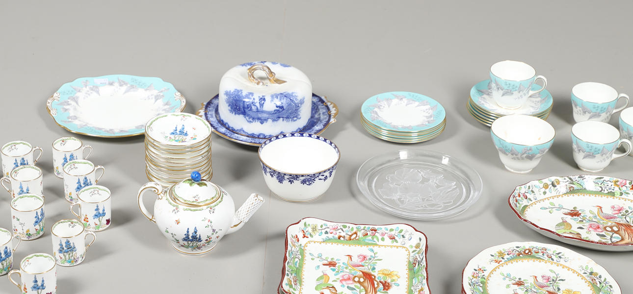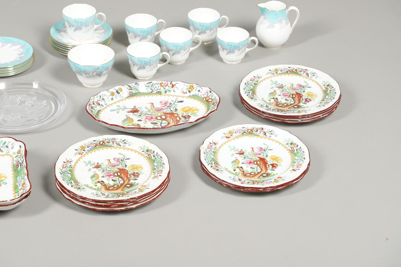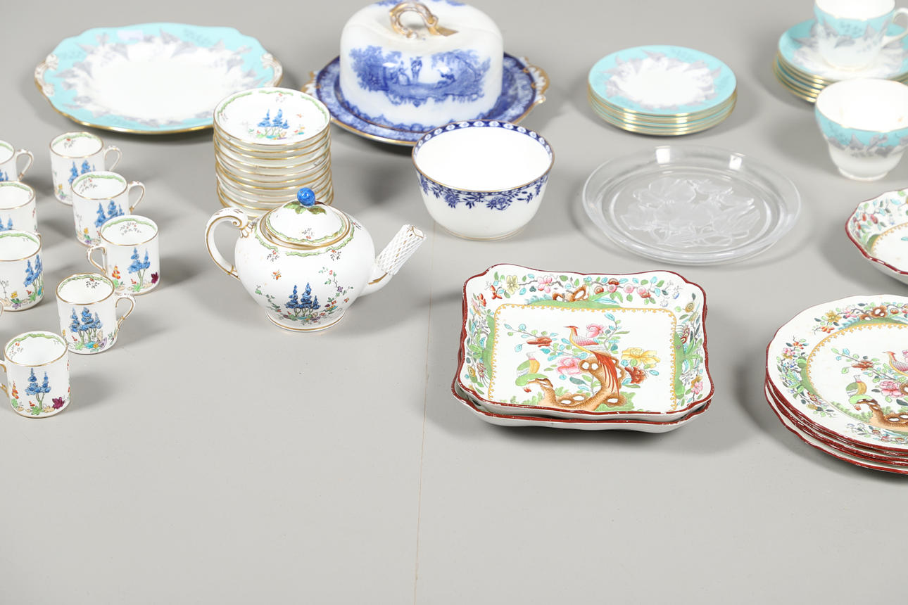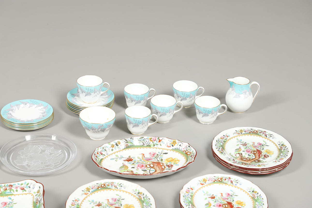 with teapot, twelve cups and saucers, a Wedgwood 'Buxton' part tea set with six cups, twelve saucers, sandwich plates, sugar bowl and milk jug, a Copeland Spode dinner wares, together with a Doulton cheese dish and dome, a MInton sugar bowl and a glass plate.