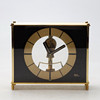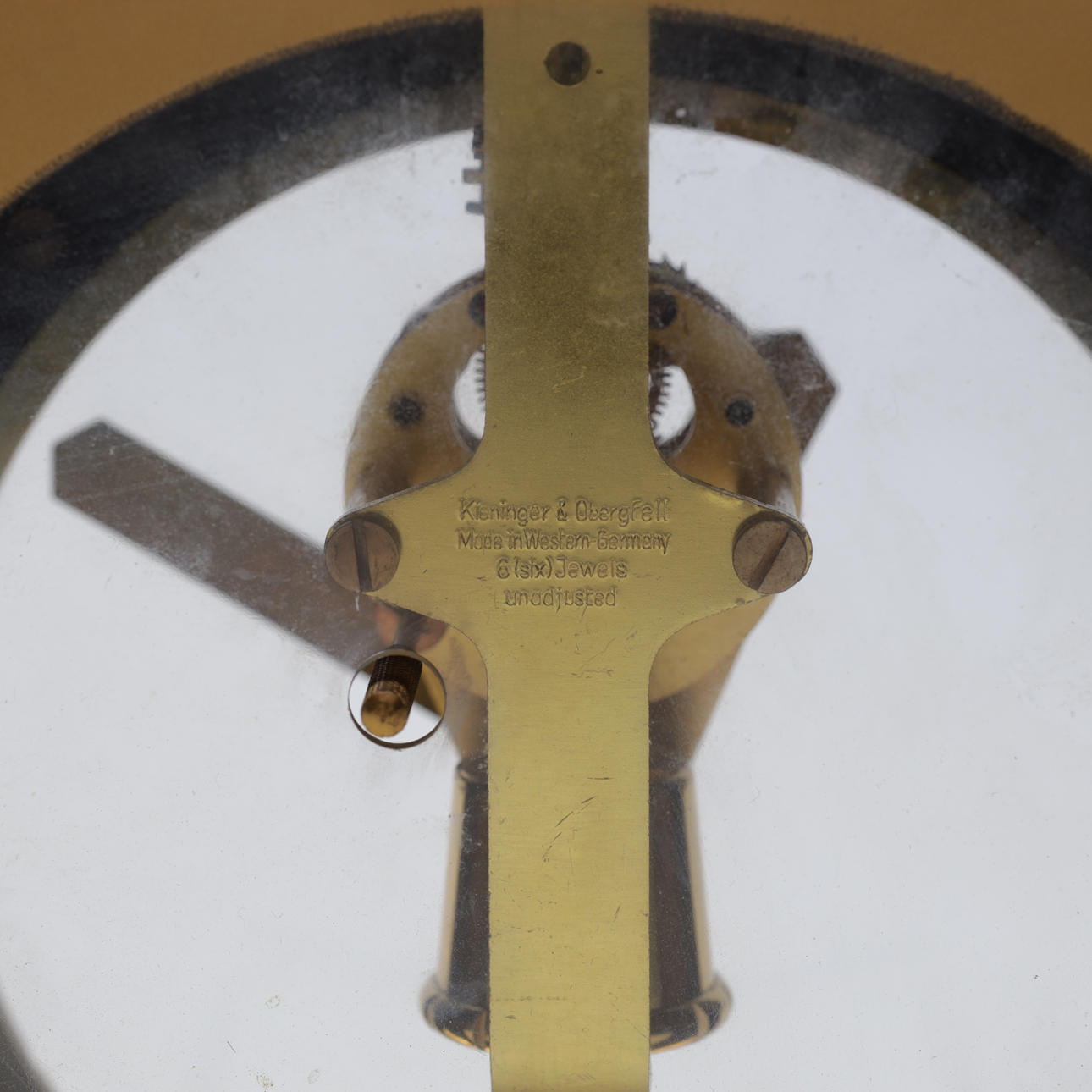 Body in solid brass with blackened hands, indexes and dial. Transparent front/back. Marked "Kieninger & Obergfell, Made in West Germany" on the back and "Kundo Electronic" on the front. The pendulum is powered by a magnetic pulse with a C battery.