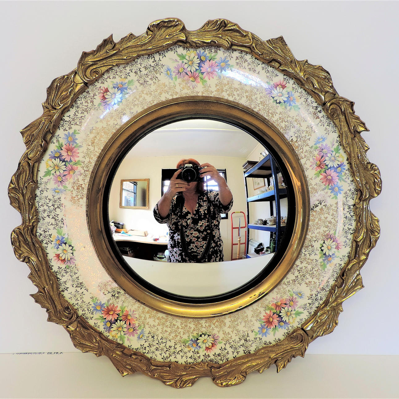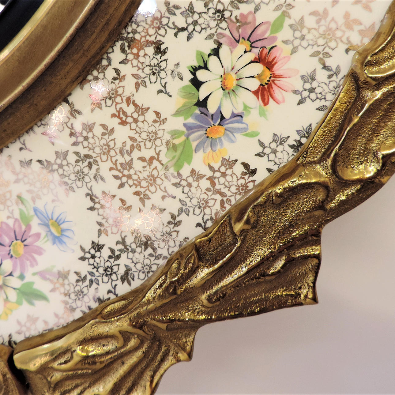 An Edwardian wall mirror, circa 1900 in date, with the makers mark of Burgess & Leigh verso. It is made of porcelain decorated with a floral pattern, has an ormolu border and a central mirror. It measures 48cm diameter.
