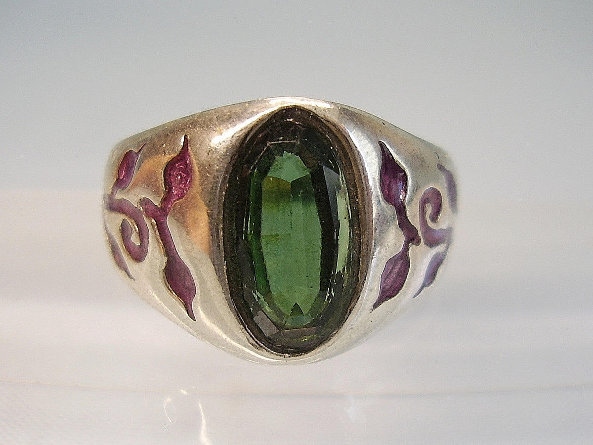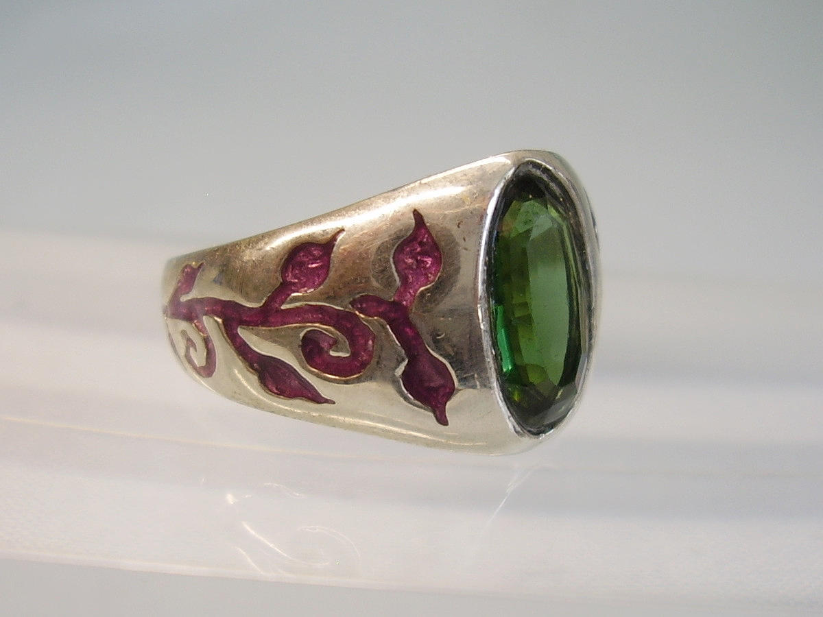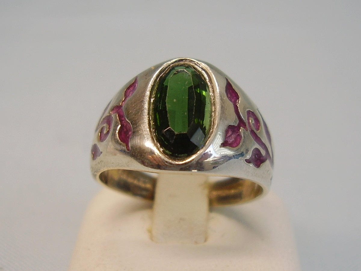 It is set with a real, tested oval-cut tourmaline of approx. 3 cents The ring shoulders are enameled with tendrils of flowers.