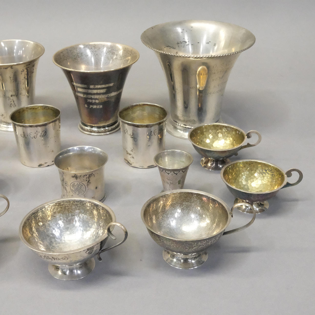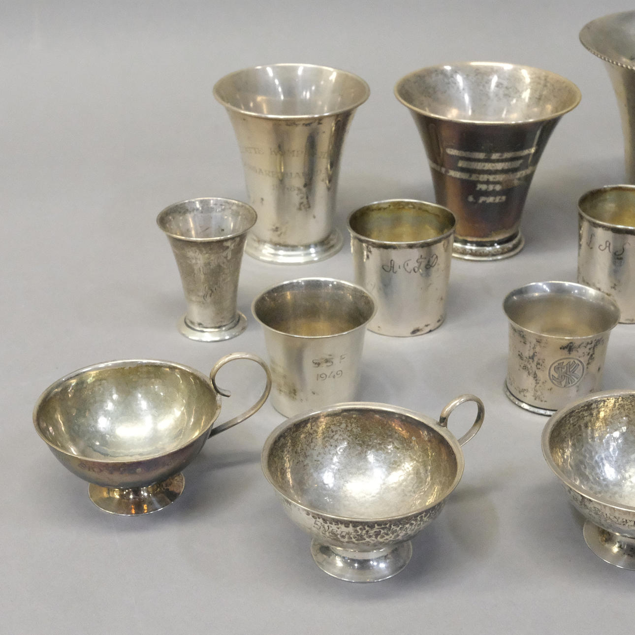 Two cups unmarked, engraving, Normal wear and tear, dents.