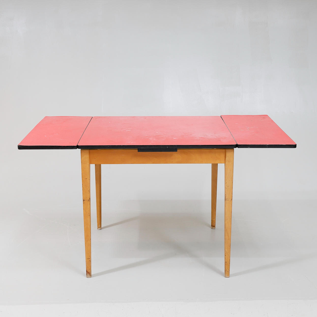 Frame of stained hardwood. Board with laminated perstorp board. Two pull-out discs of 30 cm. Length approx. 80 cm. Width approx. 75 cm. Height about 75 cm.