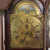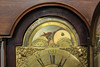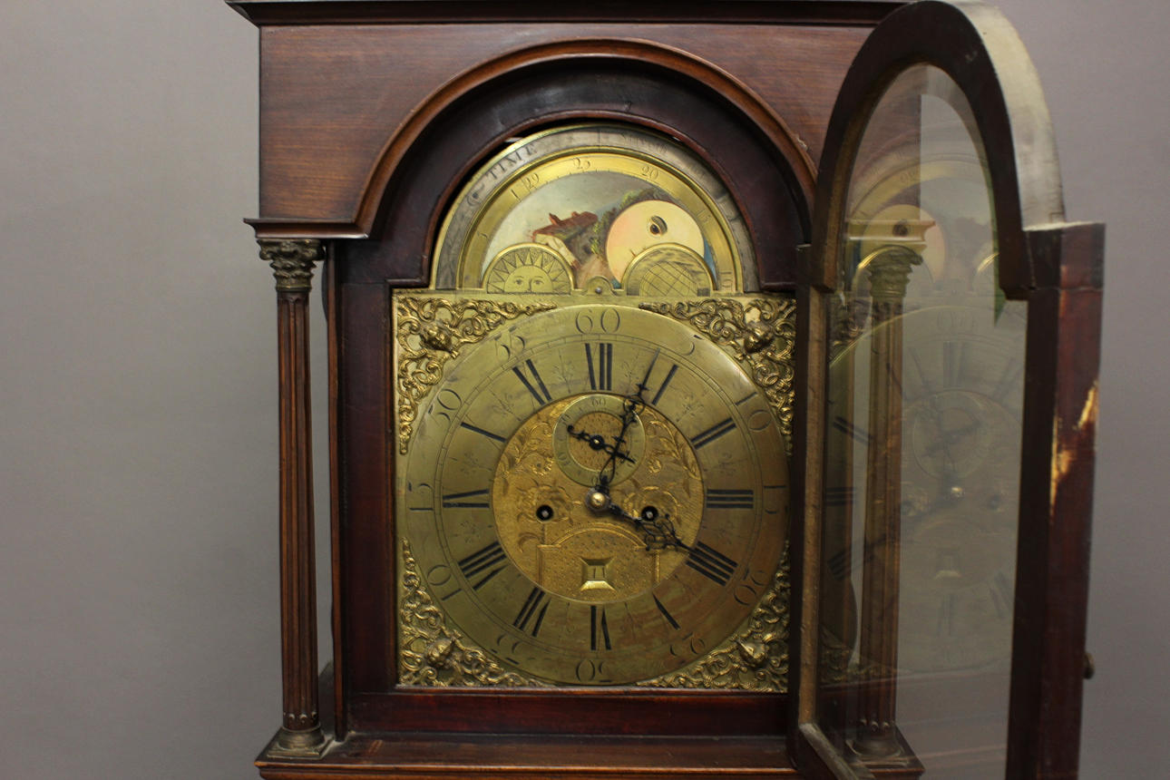 the brass dial signed John Stancliffe, with chapter ring displaying both Arabic and Roman numerals surrounding a floral engraved central dial with subsidiary seconds dial and date aperture, the painted moon phase dial with cottage and maritime scenes below a silvered arch reading 'TIME Stayeth not', on a brass eight day two train movement striking to a bell, the case with Corinthian columns, shaped door and panelled base, with two weights, pendulum and winders, height 233cm
