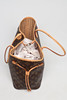 Bag in monogrammed canvas and core leather, details in plated metal. Internal patterned lining. A zippered side compartment. Loop for attachment of key chain. Marked LOUIS VUITTON PARIS made in France, VI3077. Dust bag included. Dimensions approx. 29 cm, 32x16 cm.