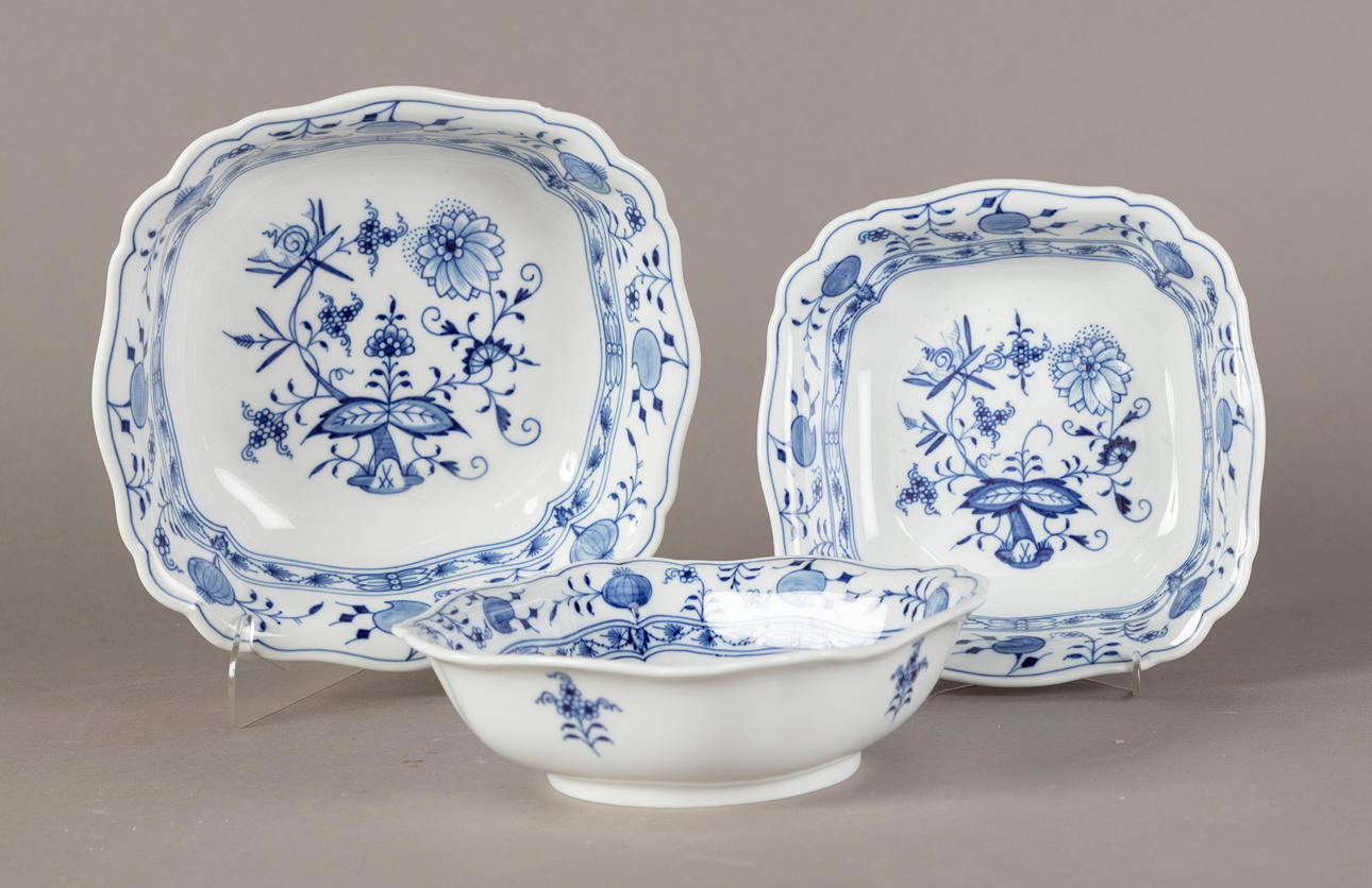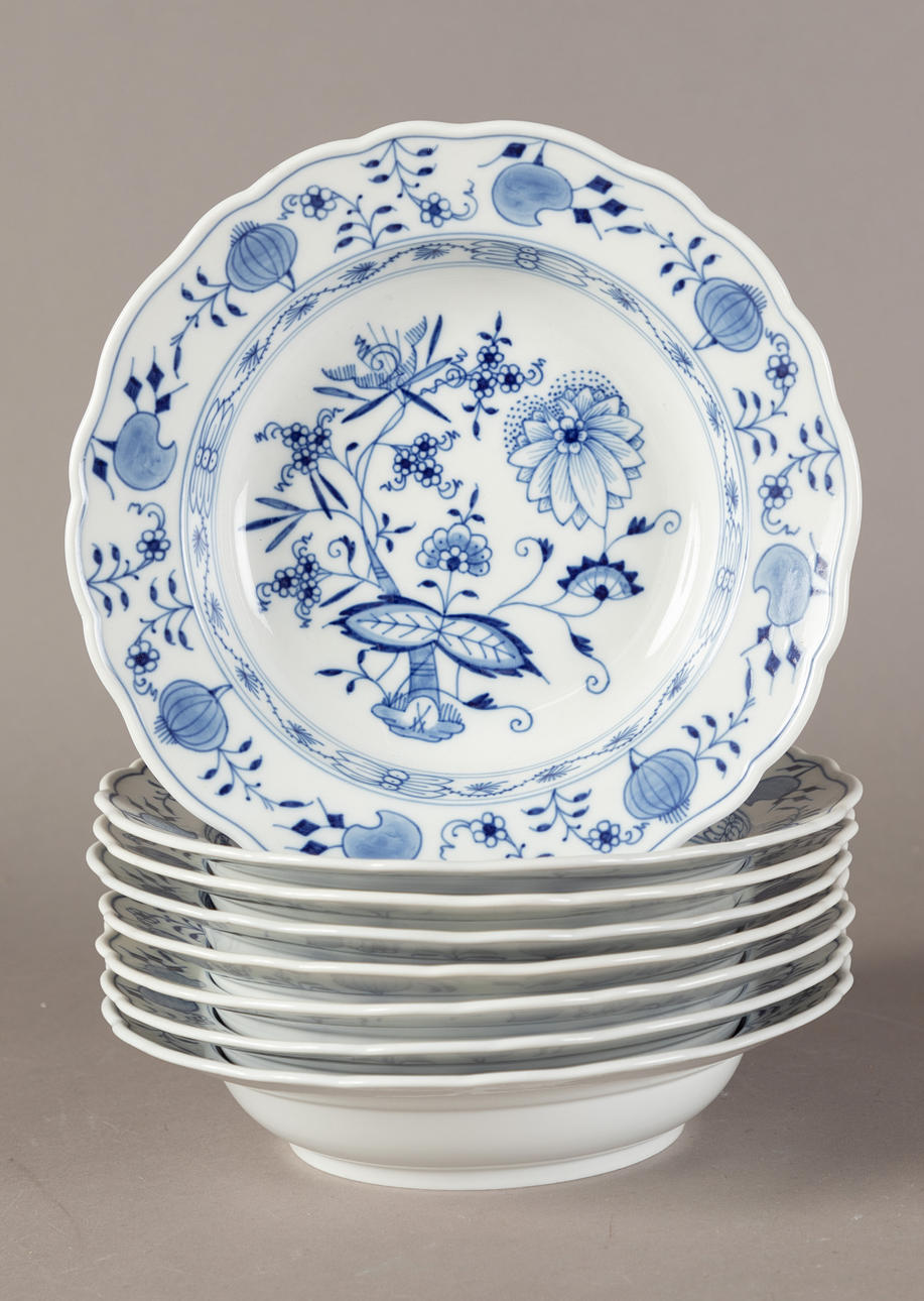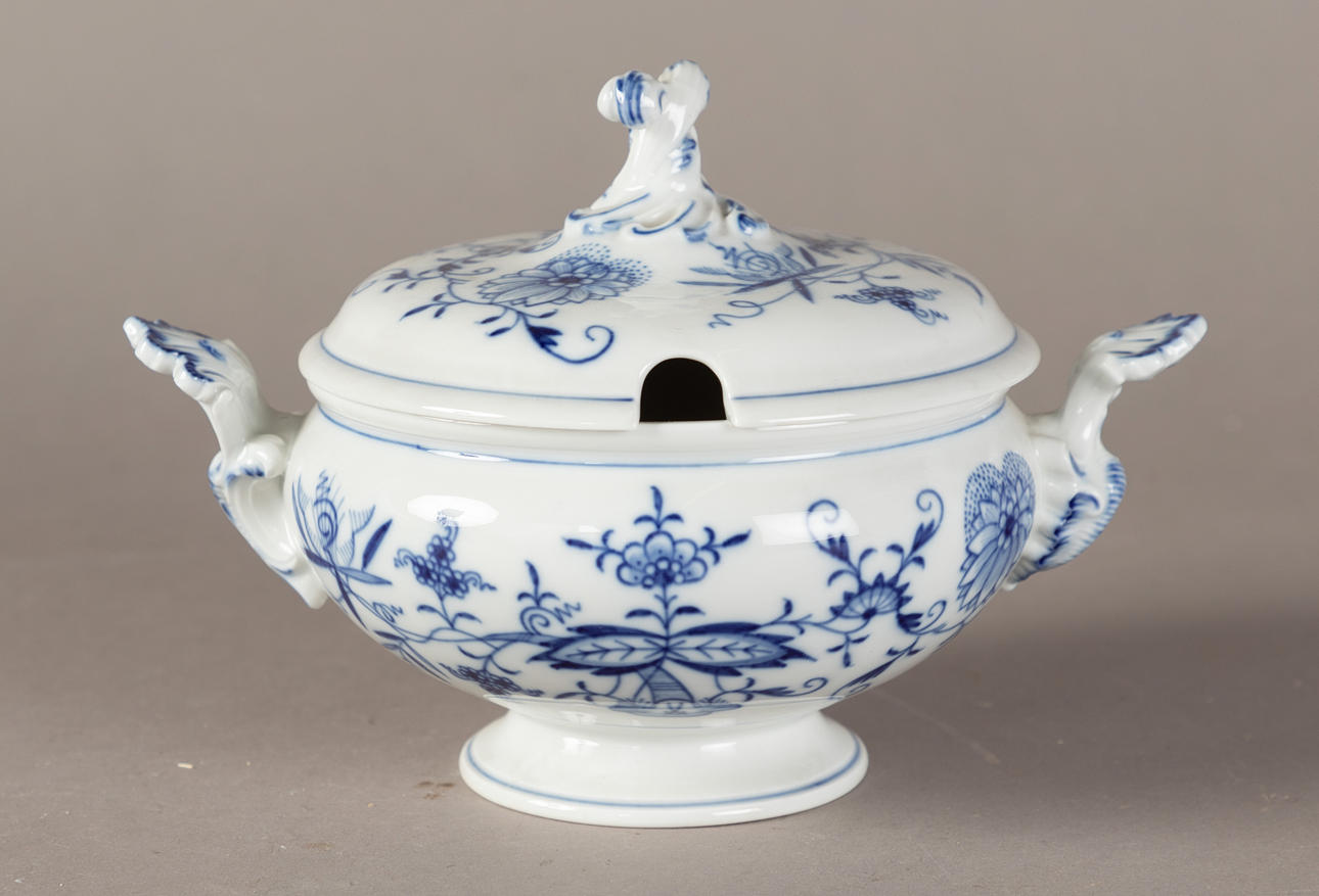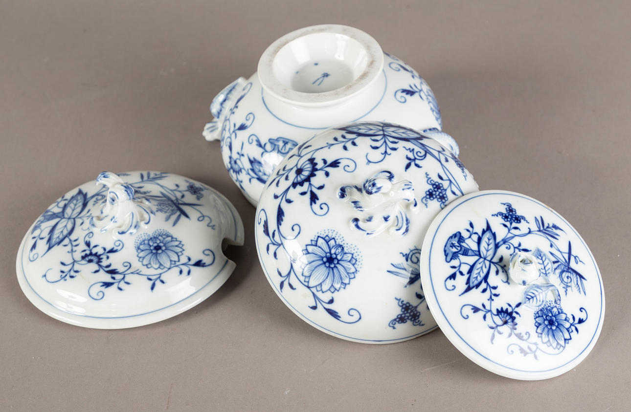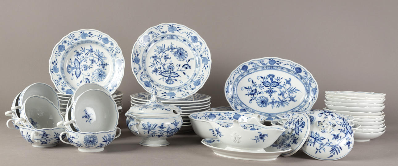 White porcelain, shape "Neuer Ausschnitt", decor "onion pattern". Underglaze blue crossed swords mark, partly II and IV choice. 51 pieces, consisting of 10 dinner plates (2x II choice, 1x chipped on the base ring), 8 soup plates (2x II choice), 11 soup cups (1x II choice), 12 saucers (2x II choice, 1x chipped), 1 small tureen (2nd choice), 1 round vegetable bowl (2nd choice), 3 square vegetable dishes in different sizes (1x II choice, 2x on the base knocked), 1 sauce boat (1 handle is missing), 2 oval platters (1x II choice, 1x IV choice) and 2 different lids (minimal bumped on the knobs).
