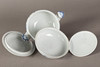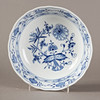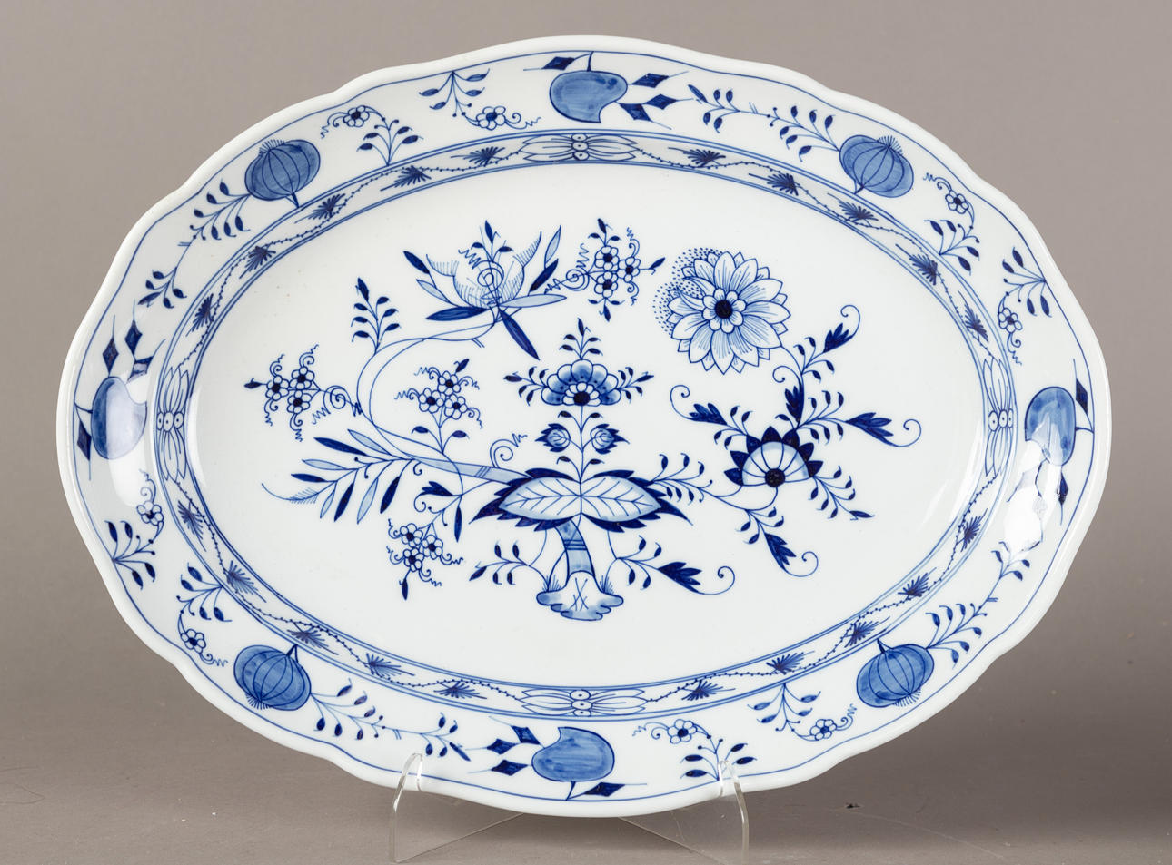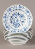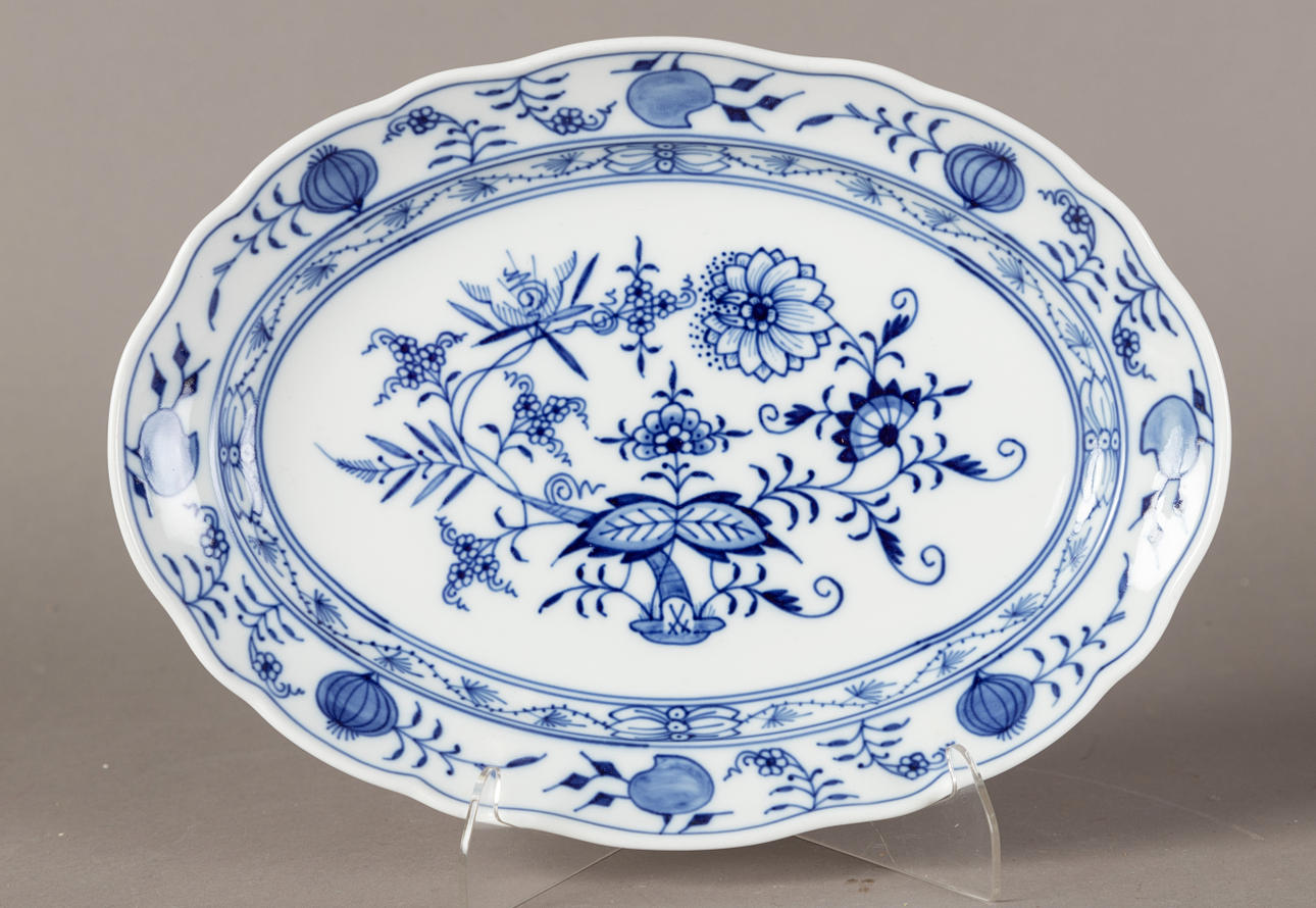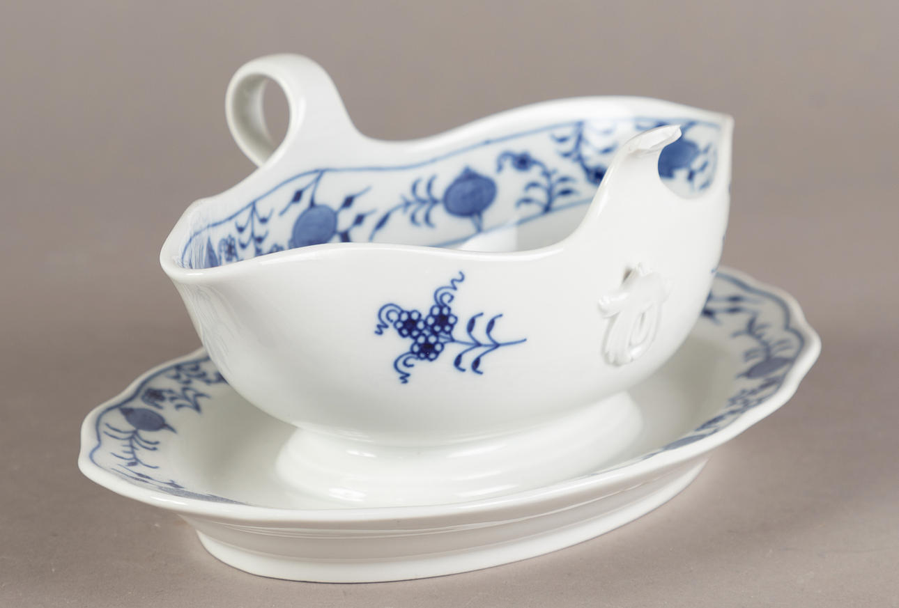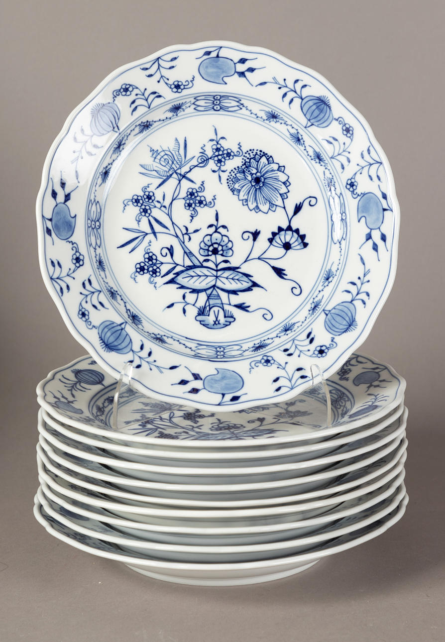 White porcelain, shape "Neuer Ausschnitt", decor "onion pattern". Underglaze blue crossed swords mark, partly II and IV choice. 51 pieces, consisting of 10 dinner plates (2x II choice, 1x chipped on the base ring), 8 soup plates (2x II choice), 11 soup cups (1x II choice), 12 saucers (2x II choice, 1x chipped), 1 small tureen (2nd choice), 1 round vegetable bowl (2nd choice), 3 square vegetable dishes in different sizes (1x II choice, 2x on the base knocked), 1 sauce boat (1 handle is missing), 2 oval platters (1x II choice, 1x IV choice) and 2 different lids (minimal bumped on the knobs).