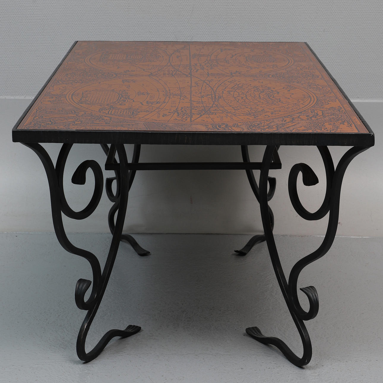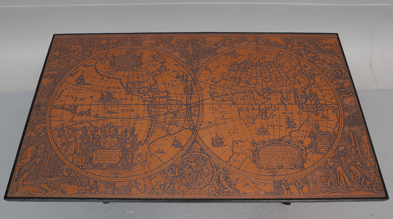 2493435. COFFEE TABLE with copper top, iron, world map, 1900s.