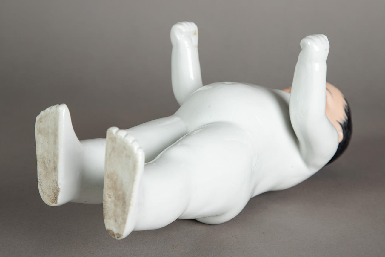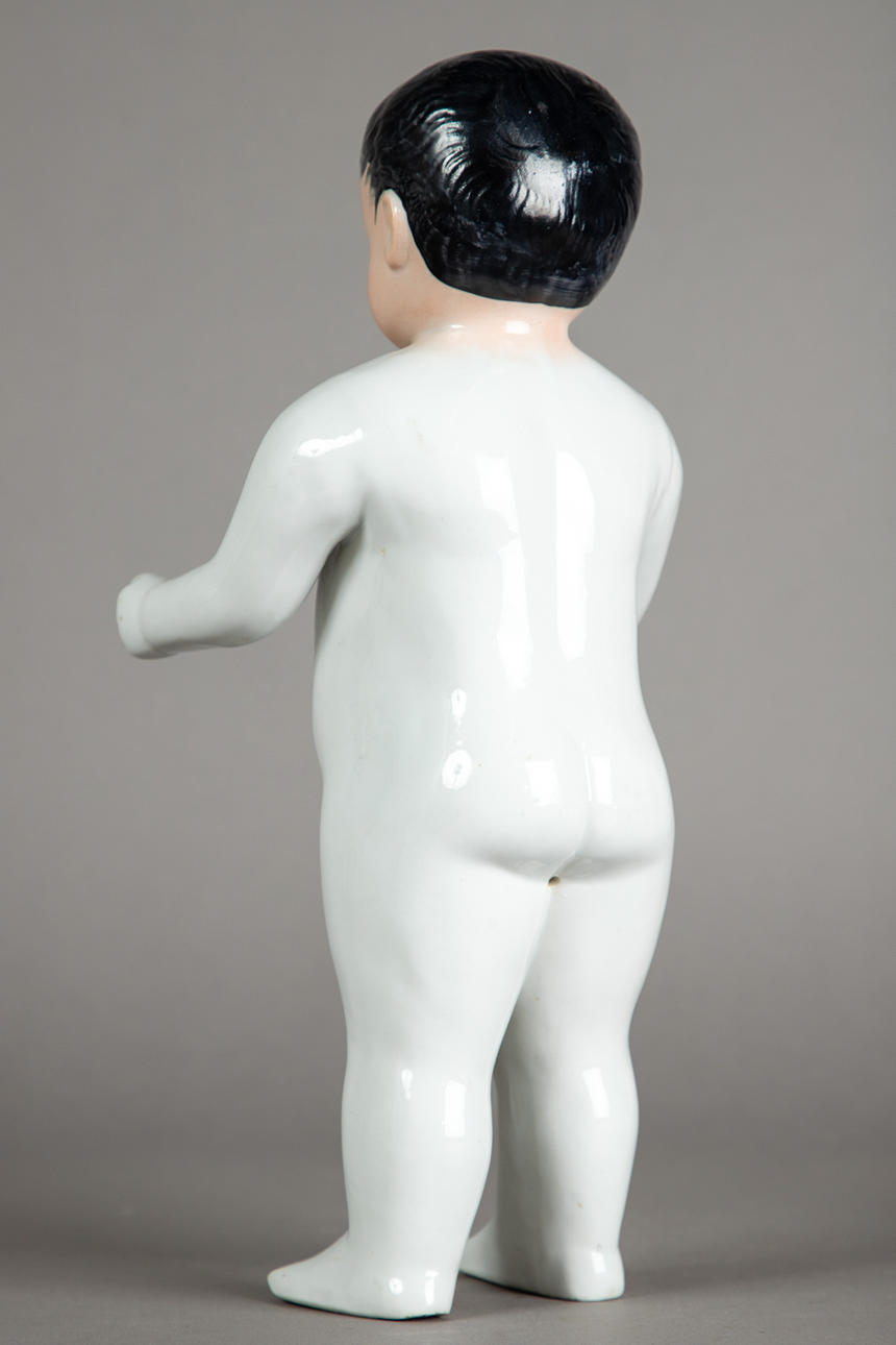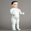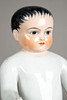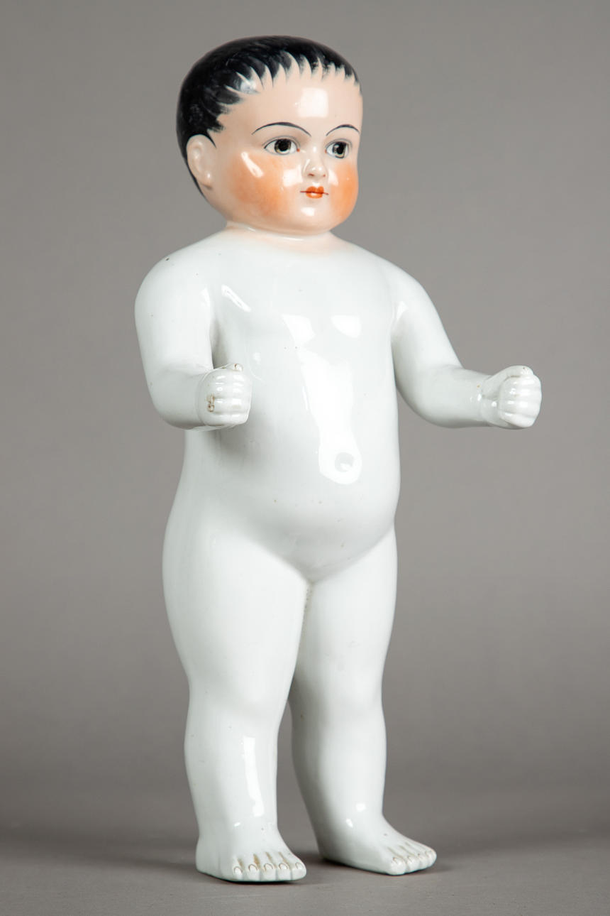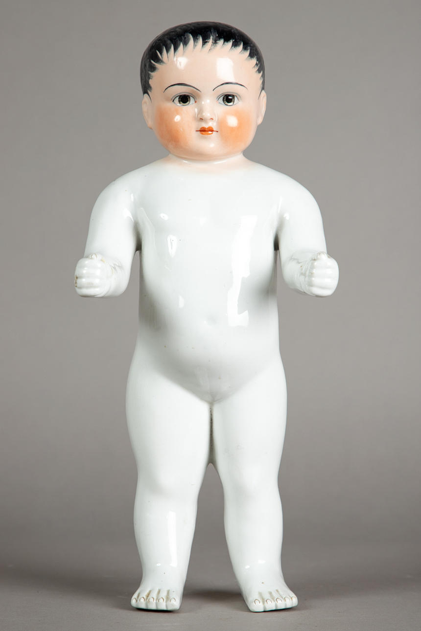 bath doll "Naked frog" made of porcelain, modeled and glazed by hand, unmarked, hand-painted head, gray eyes with red inner eyes, fine lines and eyebrows, black painted hair, around 1880, size approx.: 33 cm.