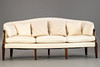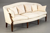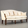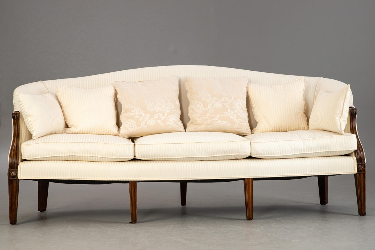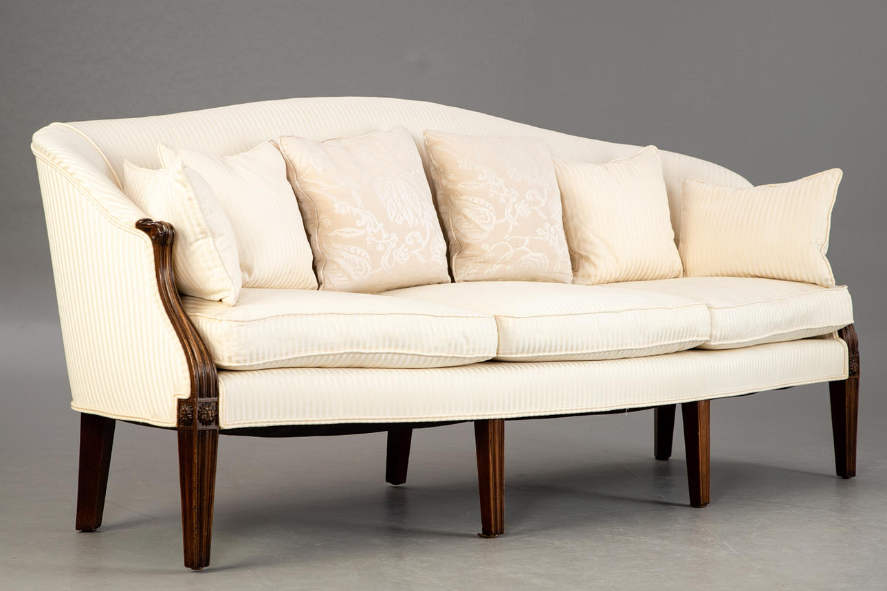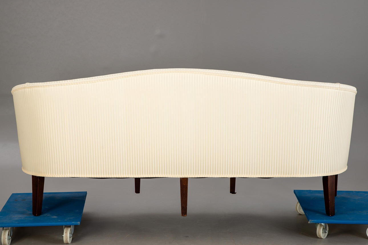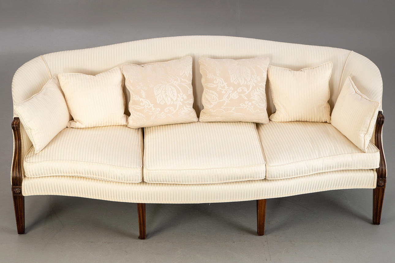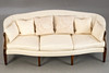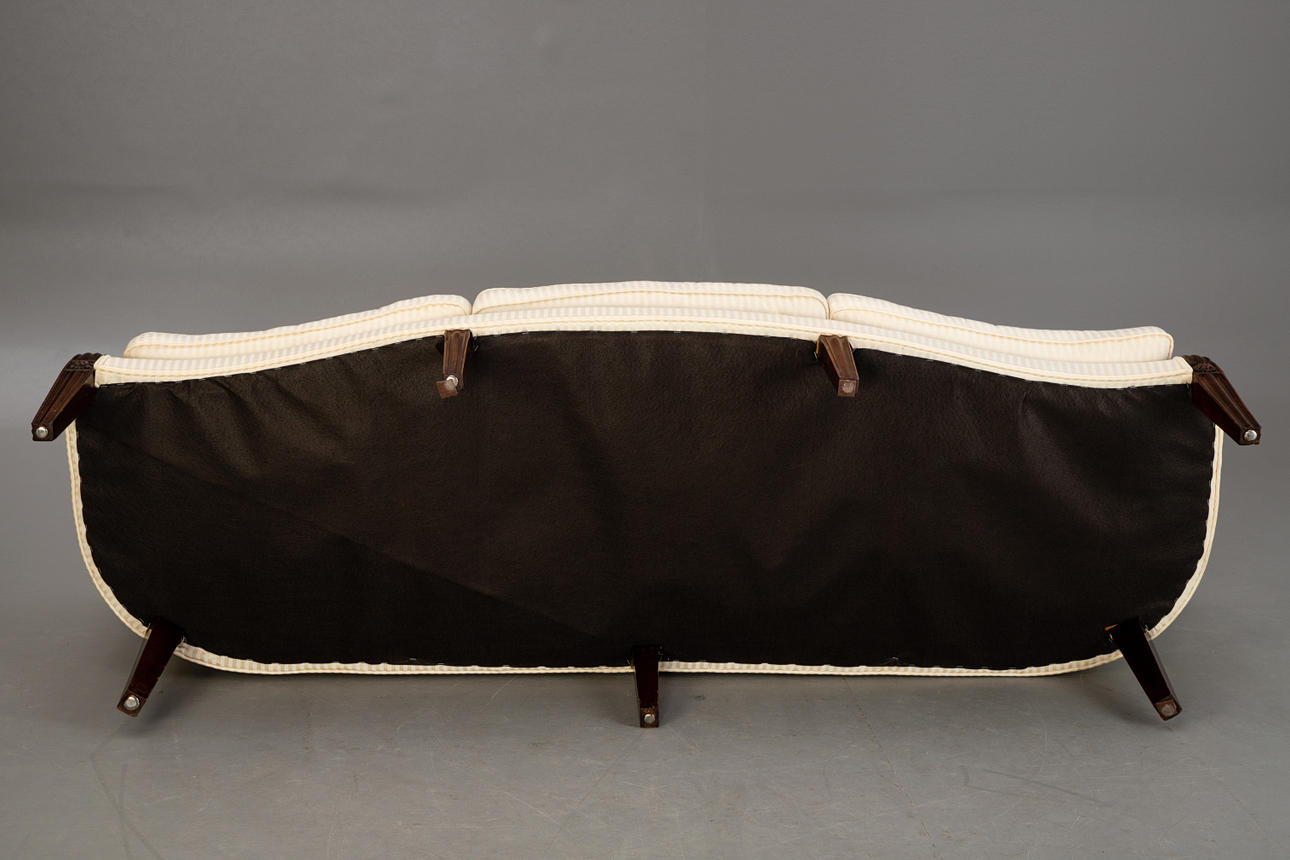 Mahogany/Textile in off-white tones. Eight conical, fluted square legs, cuboids decorated with rosettes on the sides, reaching over the curved armrests. The rectangular seat with three loose seat cushions. Curved, fully upholstered backrest. Six decorative cushions in different designs. HxShxWxD:approx. 92x47x214x65 cm.