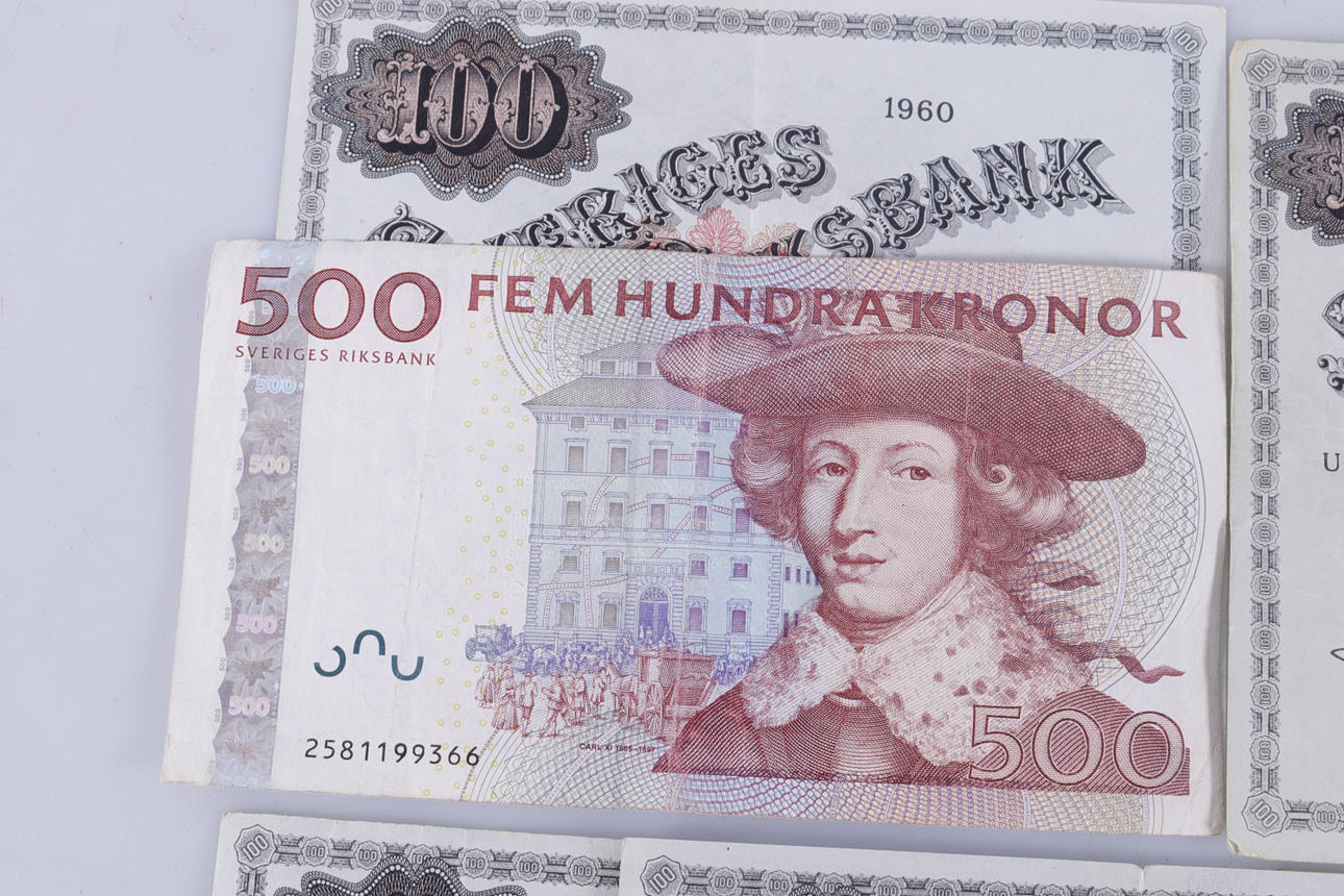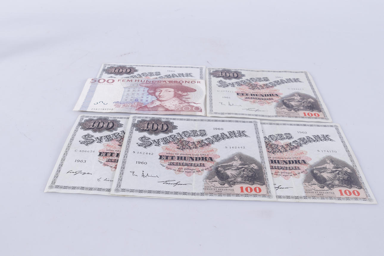 5 pcs 100 SEK banknotes, 2 pcs 1960, 1961, 1962, 1963 one 500 SEK Nominal value 1000 SEK.