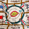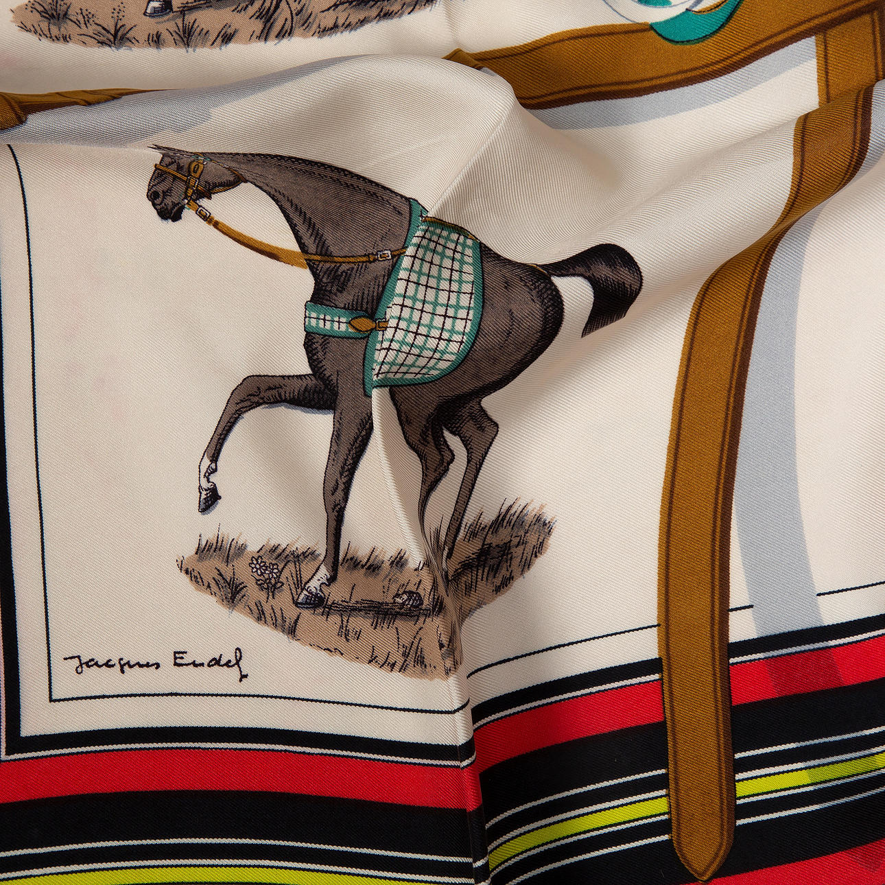 Silk, marked "HERMÈS PARIS". Designed Jacques Eudel in 1974. Motifs of horses and bows. About 87 x 87 cm.