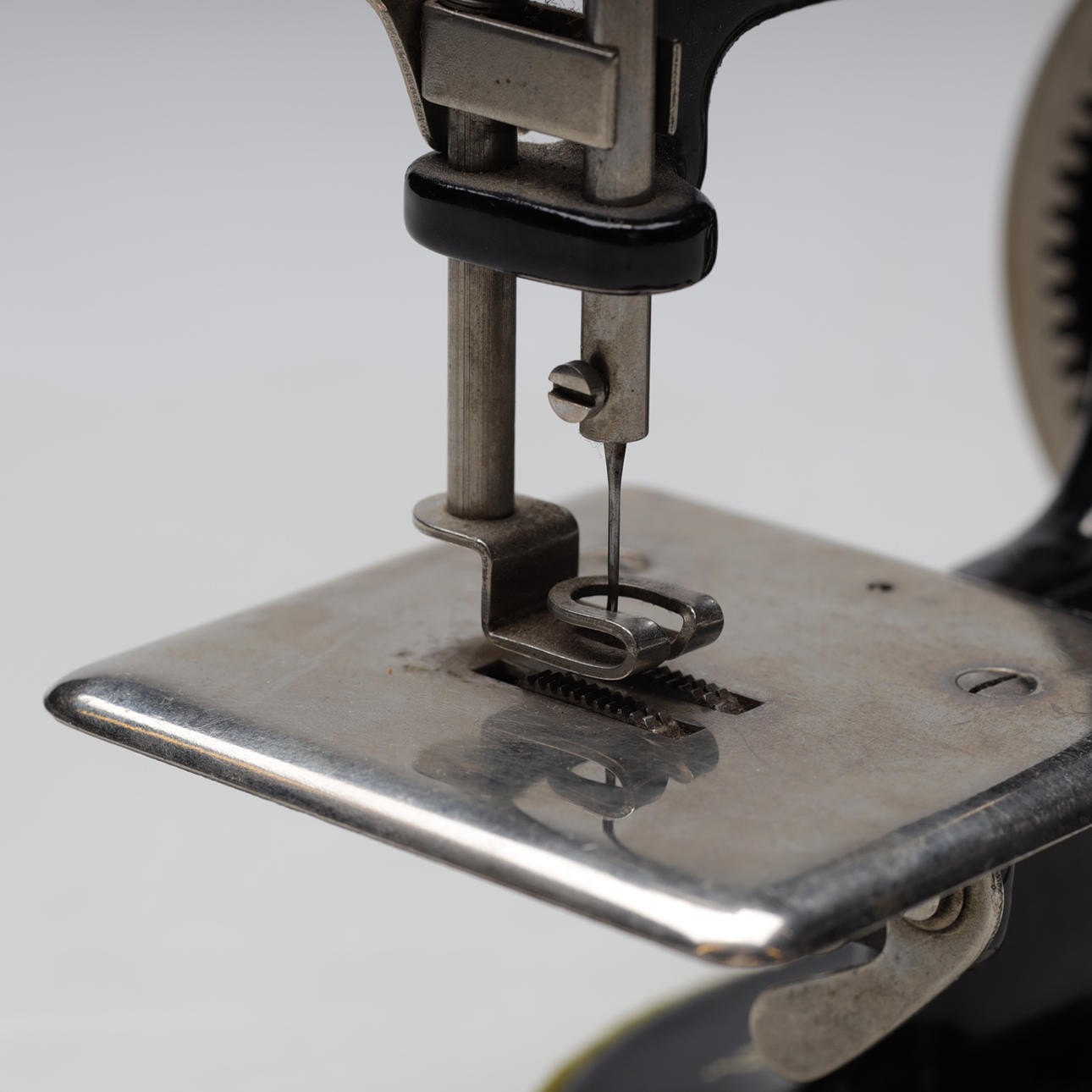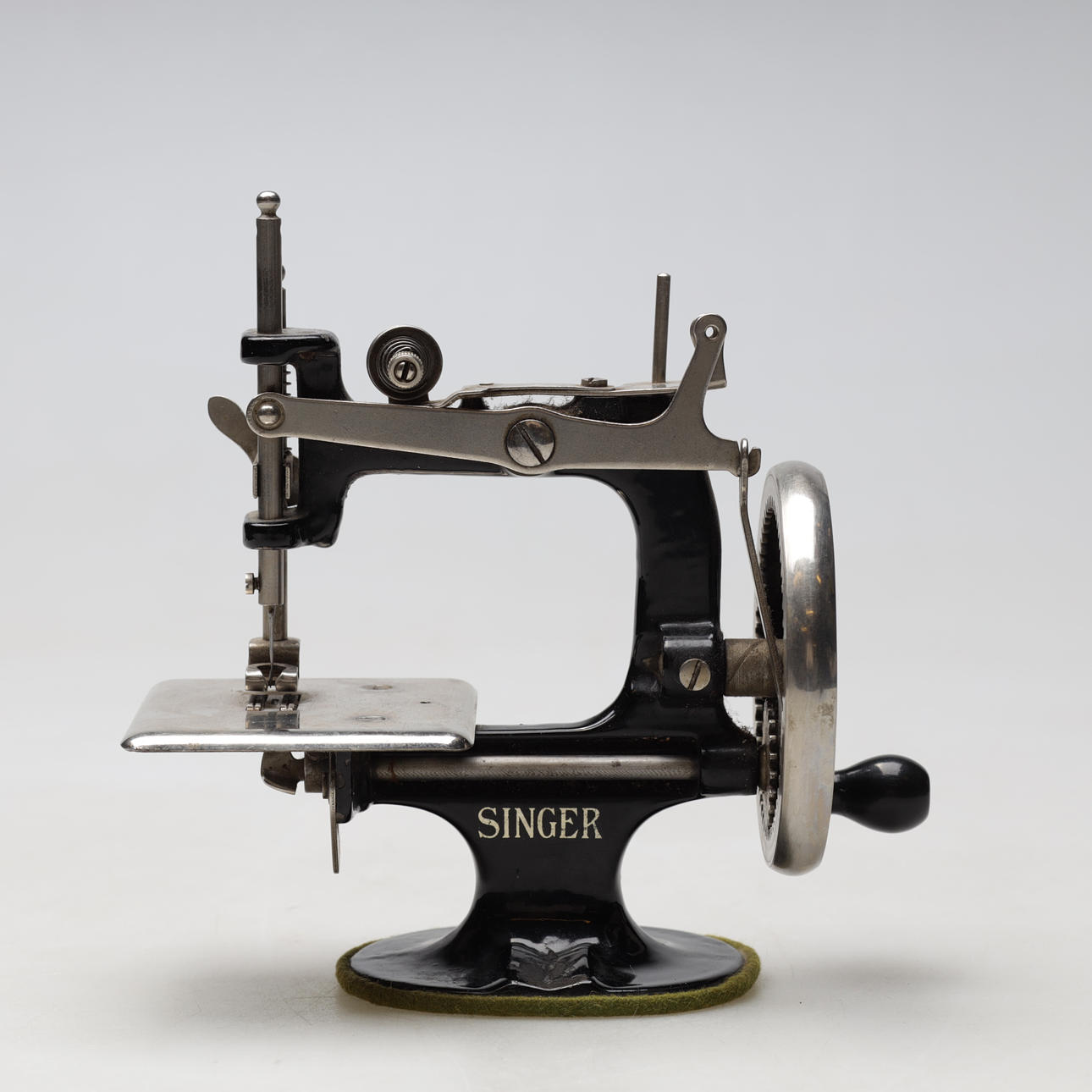 Sewing machine, miniature model, marked "Singer". Length about 19, height about 18 cm.